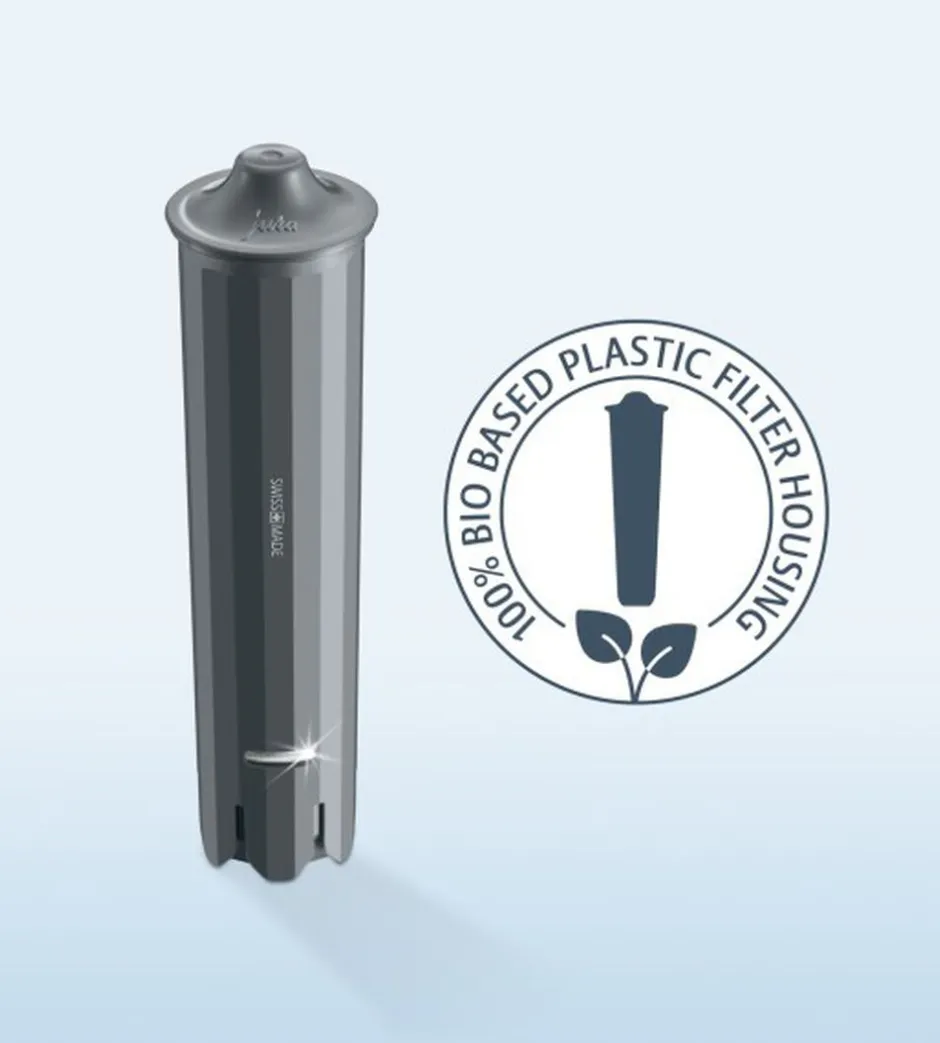 ISCC-certificerede filtreJURA introducerede i 2025 100% bio-baserede filterpatroner. De nye filtre har et Bio Based logo på pakningen, så du let kan kende dem. Patronerne og produktionen heraf overholder den internationalt anerkendte standard for bæredygtig cirkulær økonomi og bioøkonomi: ISCC PLUS-certificering*. Patronerne er fremstillet af tallolie, et biprodukt fra papirmasse- og papirindustrien, der stammer fra bæredygtigt forvaltet træ. Ved en ISCC-certificering stilles der er strenge krav til produktionsmetoder (miljøkrav i forhold til skovrydning og biodiversitet). JURAs filtre er produceret af tallolie (vegetabilsk olie), produktionen er CO2 neutral og såvel filterpatron som filtergranulatet kan genbruges og f.eks. anvendes til møbler, kabler m.v. og dermed indgå i en cirkulær økonomi. * ISCC står for International Sustainability & Carbon Certification og er et globalt certificeringsprogram for cirkulær økonomi og bioøkonomi, der støtter bæredygtige, fuldt sporbare, afskovningsfrie og klimavenlige forsyningskæder. Med certificeringen bidrages til en miljømæssigt, socialt og økonomisk bæredygtig produktion.