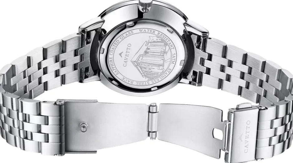Den blå urskive på Cavetto Classic CV0046 står i smuk kontrast til dens sølvfarvede urkasse og bezel, alle fremstillet af rustfrit stål. Den rustfri stål lænke komplementerer det samlede design og er sikret med en butterfly lås for nem brug. Uret er udstyret med et kvarts urværk, der sikrer præcis tidsvisning. Det safirbelagte mineralglas beskytter urskiven og tilbyder ridsemodstand til daglig brug. Med en vandtæthed på 5 ATM er dette ur egnet til let vandkontakt, såsom regn eller håndvask.