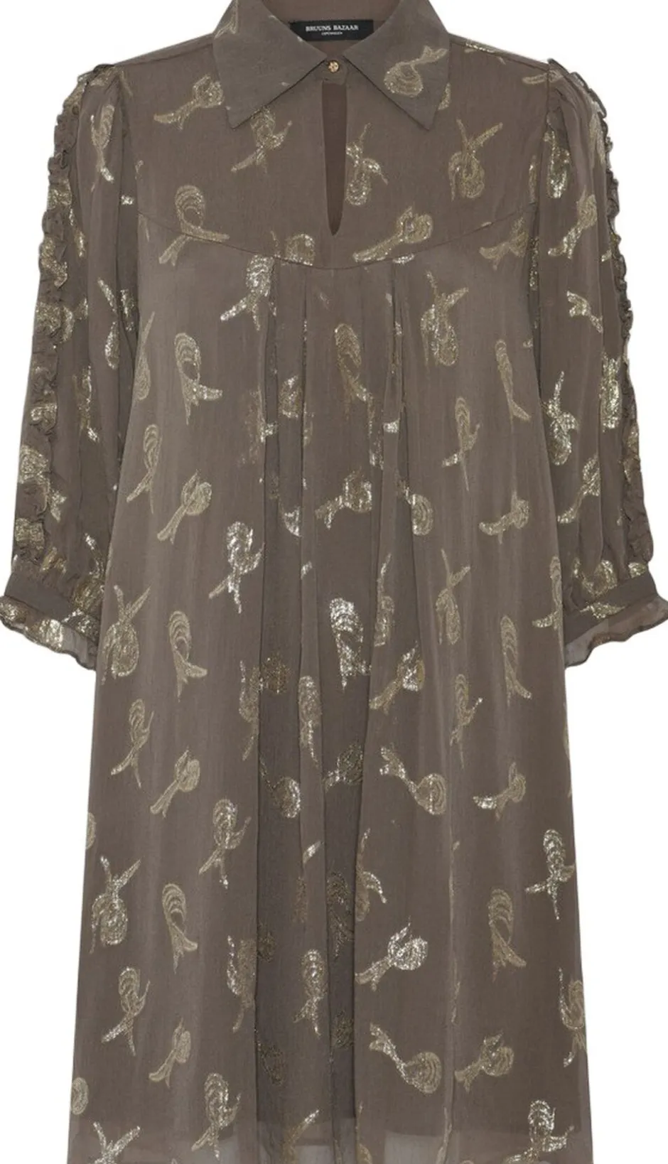 AmaranthusBBTammi-kjolen er en Løs kjole i knælængde med krave og pufærmer. Den transparente overflade og det gyldne tryk giver den et legende og elegant look. Sæt den sammen med støvler og tights til efteråret, eller style den med hæle og en håndtaske til en festlig aften. – Løs pasform – Knælængde, 95cm i størrelse 36 – Puffærmer med elastiske manchetter – Krave med nøglehulsåbning