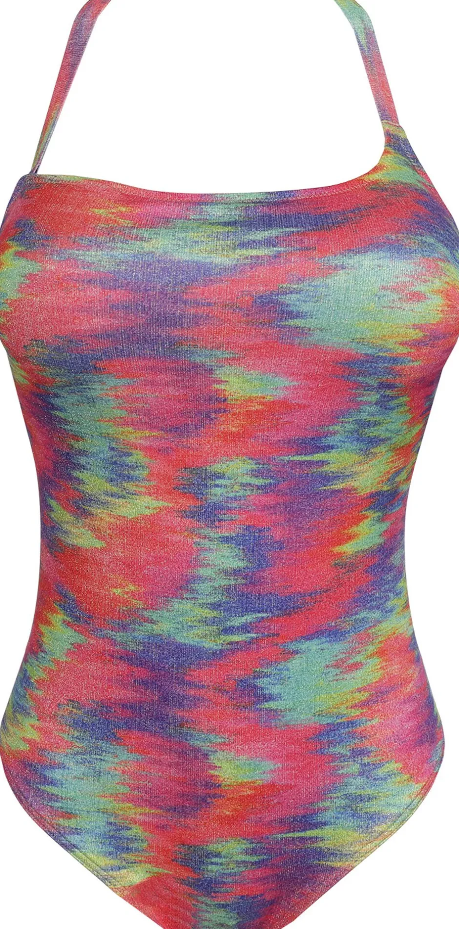 Stilfuld badedragt med højtskårne ben. Du kan bære den med en eller to stropper. Sexet og stilfuld! Skålene giver god støtte, og det høje snit får dine ben til at syne længere. Flerfarvet print med subtil glans.