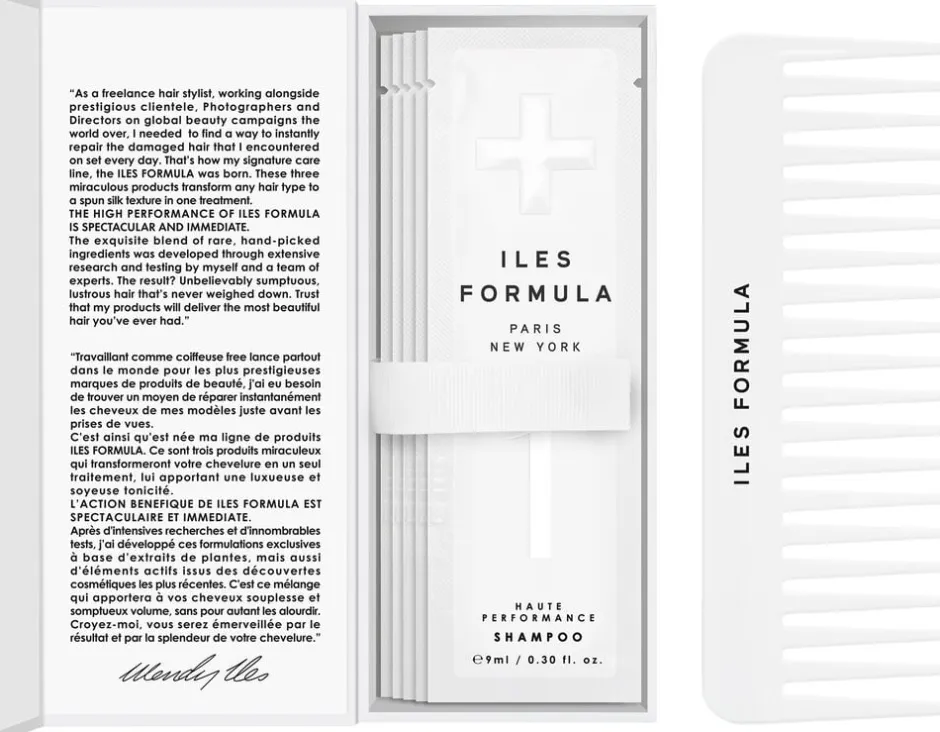 Iles Formula Discovery box indeholder 3x shampoo, balsam og serum sachets samt en fordelingskam. Velegnet til alle hårtyper. Let parfumeret med en delikat duft af hvide blomster.