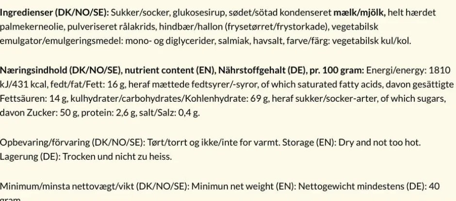 Håndlavet dansk kvalitet. Bagsværd Lakrids Hindbær er fremstillet med hindbær i Bagsværds kendte smag. Lakridsen har sin karakteristiske smag, fordi den fremstilles af det fineste lakridspulver, og fordi den frembringes af Maillard-reaktionen, hvor mælkeprotein og sukker reagerer med hinanden i gryden. Efter kogning hældes lakridsen i forme, hvor den hærder natten over, inden den håndskæres og pakkes. Lakridsen udskæres med en robust kniv.
