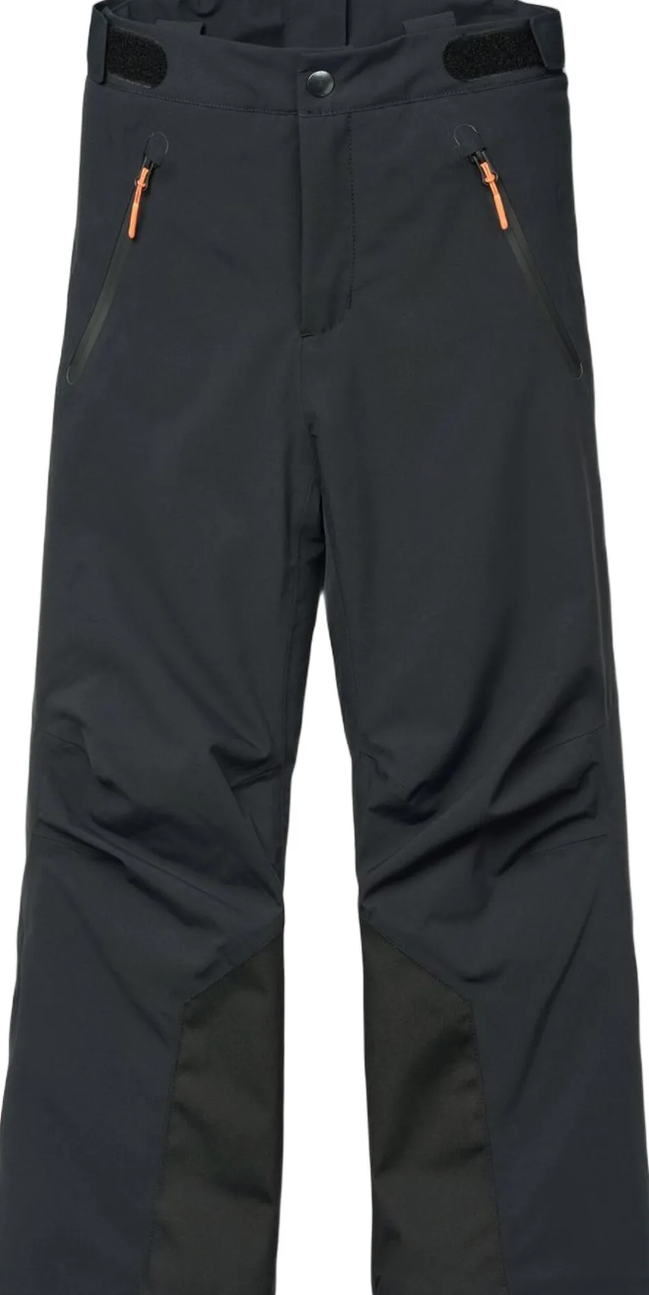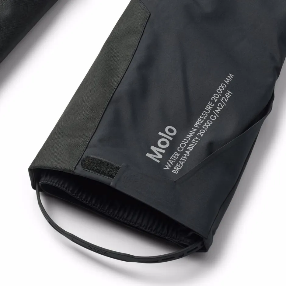 Disse sorte overtræksbukser fra Molo er lavet i genanvendt polyester. Bukserne har trykknap- og lynlåslukning, udvendige, justerbare velcro-stropper, bælte stropper til Molos seler (ekstra tilbehør), justerbar benåbning med snefang og ekstra forstærkning mellem benene. Der er vandtætte lommer, refleks bagpå, fleece foret udsatte steder og vatteret med 3M Thinsulate.