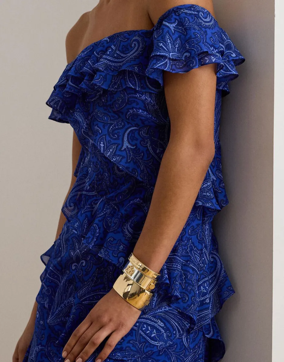 Kaskadede flæser og rynket georgette giver ubesværet bevægelse til denne fantastiske off-the-shoulder-kjole, som skildrer sæsonens tonale sjalsmønster.