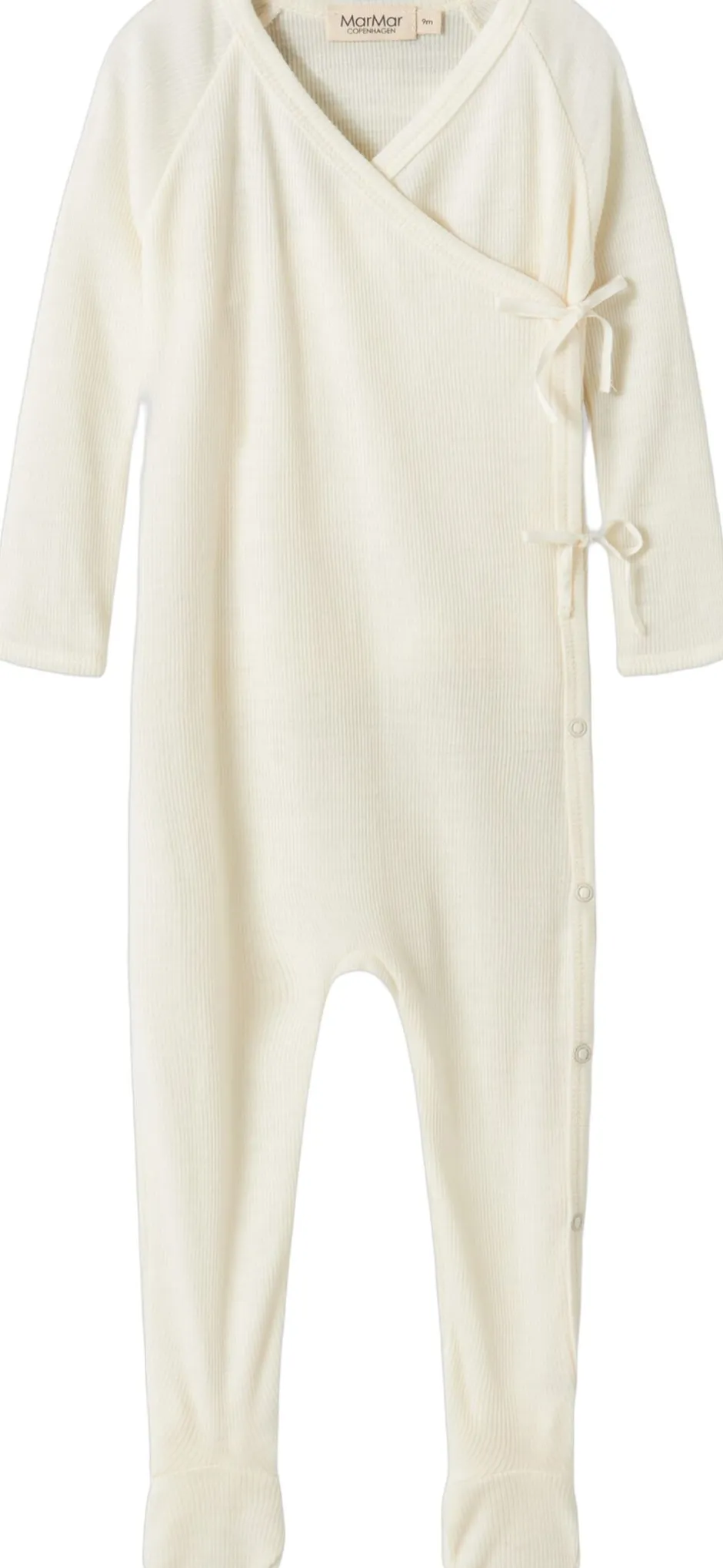 Langærmet heldragt med fødder til nyfødte. Heldragten har slå-om-lukning og lukkes med trykknapper og bindebånd