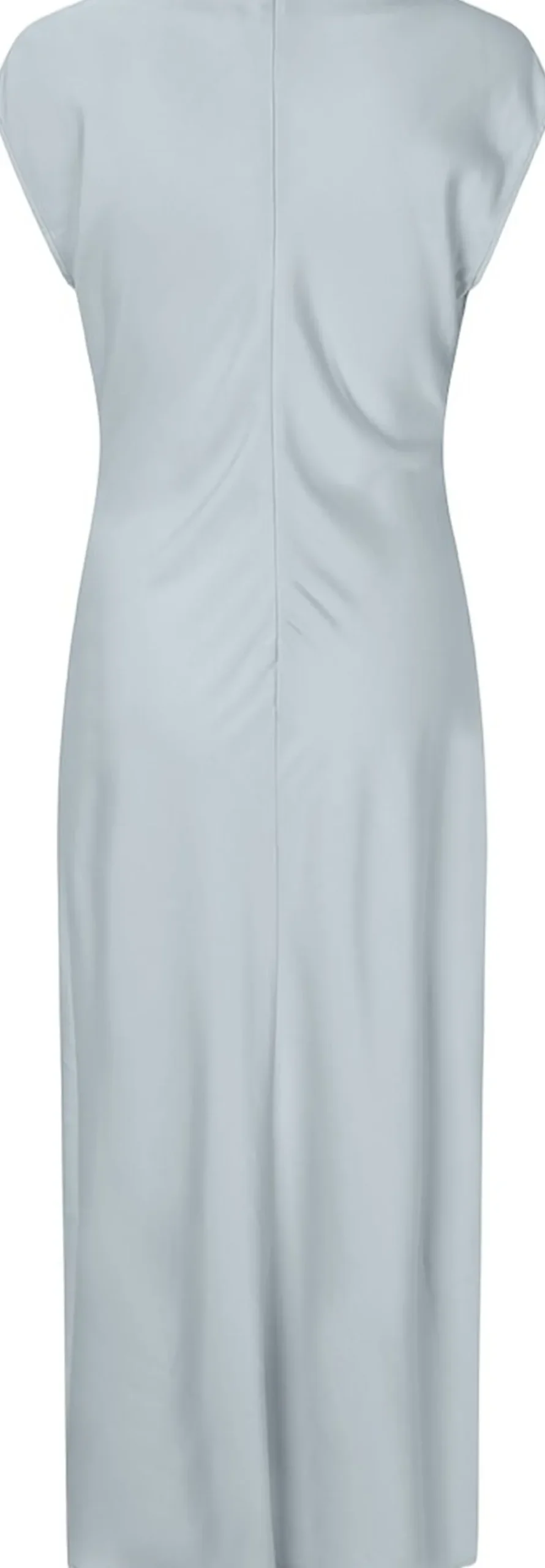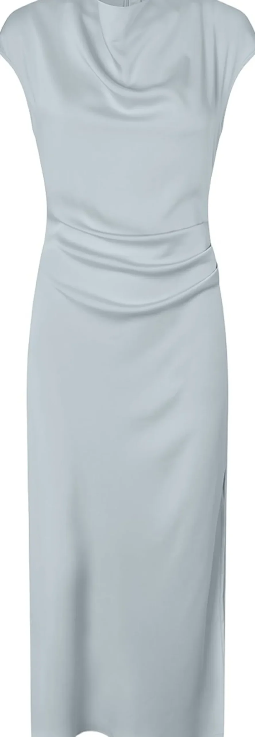 Lang ærmeløs kjole i en lys grøn med rynkedetalje i satin. TailorMD dress har en høj hals, usynlig lynlås i ryggen og en slids i siden.
