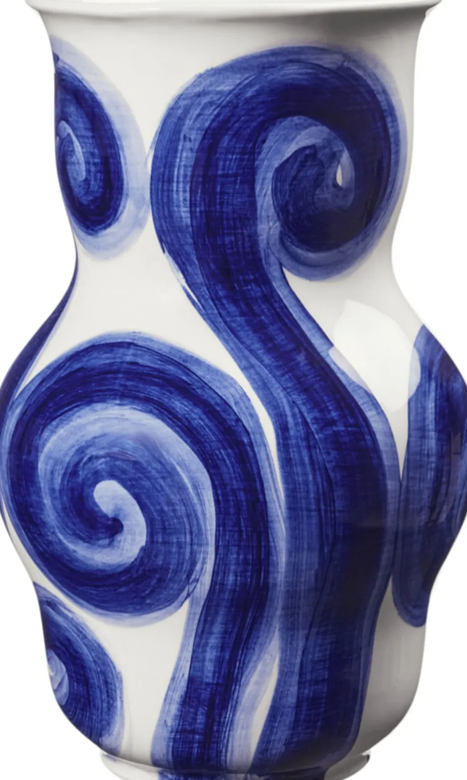 Med vaseserien Tulle hylder Kähler nostalgien og romantikken med håndmalede dekorationer inspireret af de ældre Kähler-vaser. Den store Tulle-vase på 22 cm i højden har en cremehvide bundfarve og er de-koreret med blå snørkler, der efterfølgende er glaseret. Her er penselstrøgene tydelige, organiske og naturlige og er med til at give vasen et unikt udtryk. Vasen er skabt i et lækkert autentisk og kunstnerisk udtryk i en moderne kontekst, hvor der er blevet leget med at skabe ekstra dybde og liv gennem dybe og fyldige glasurer med oprindelse i det gamle Kähler-værksted. Det er en af dygtigste malepiger fra den-gang, Tulle Emborg, der nu får æren af at lægge navn til Tulle-serien. Og du kan både se og føle, at der er et menneske bag, der har gjort sig umage med at male vasen i hånden for at skabe et ekspressivt og le-vende udtryk. I dekorationerne fornemmer du også tydeligt den kunstneriske forståelse og de intuitive bevægelser, der gør Tulle-vasen til et lille kunstværk i sig selv og tilfører den en helt særlig nostalgisk au-tenticitet. De runde former skaber en skulpturel og grafisk silhuet, så vasen også sagtens kan stå alene uden blomster som en del af en både romantisk og moderne indretning.