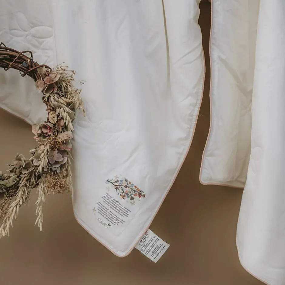 Cocoons silkedyner indeholder 100% økologisk Mulberry Silk og har et ydervår af 100% certificeret økologisk bomuld.