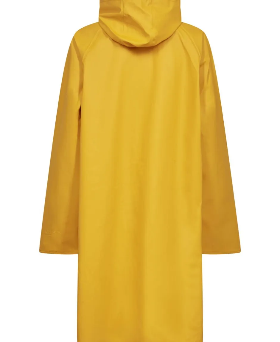 En feminin A-formet regnfrakke med Løs pasform under knæet. Regnfrakken har et diskret Ilse Jacobsen Hornbæk-logo præget på venstre ærme. Hætten er aftagelig og fastgjort med en vejrbestandig strop i kunstlæder. Stilen har sidelommer med flapper, smarte slidser i sidesømmene med trykknapper, knaplukning ved håndleddet og en 2-vejs YKK-lynlås midt foran. Indvendigt har stilen en ren og fin finish med et logobånd. Kvaliteten er en let og subtil vandtæt gummibelagt PU med polyester tricot på bagsiden, og alle sømme er dobbeltsvejsede. Stilen fås i et bredt udvalg af både klassiske og sæsonbestemte farver. Sammensætning: 100 % polyester trikot med PU-belægning. Funktionalitet: B/P 5000 mm