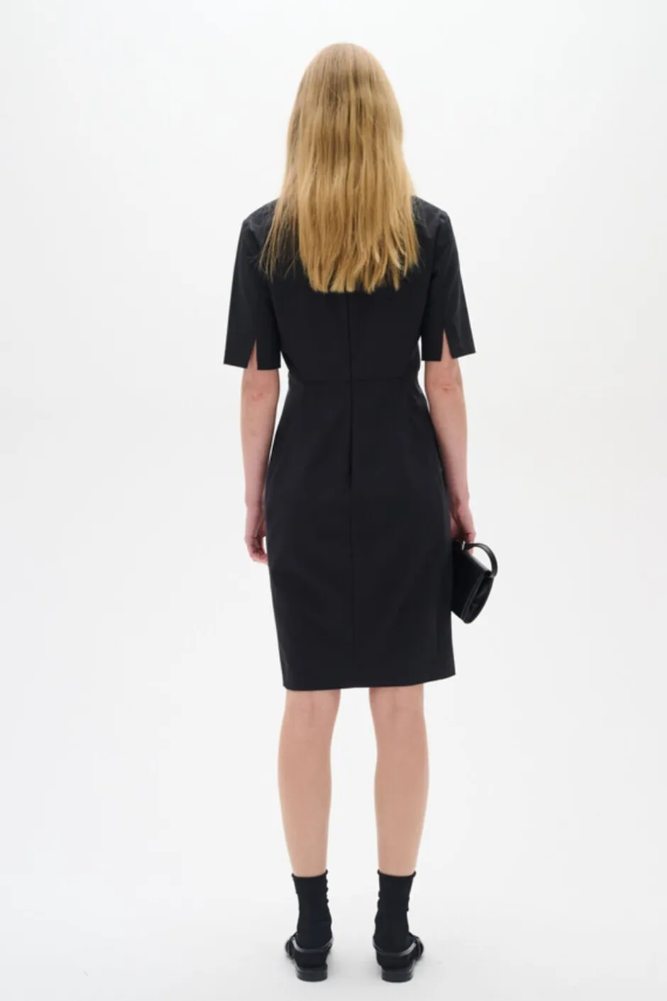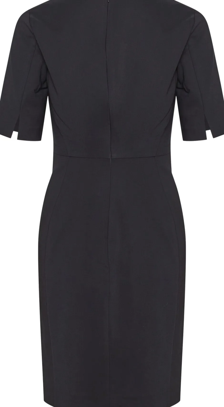 Knælang figursyet kjole med V-udskæring, korte ærmer og slids bagpå. Skjult lynlås i ryggen og regulær pasform gør den velegnet til både arbejde og arrangementer.