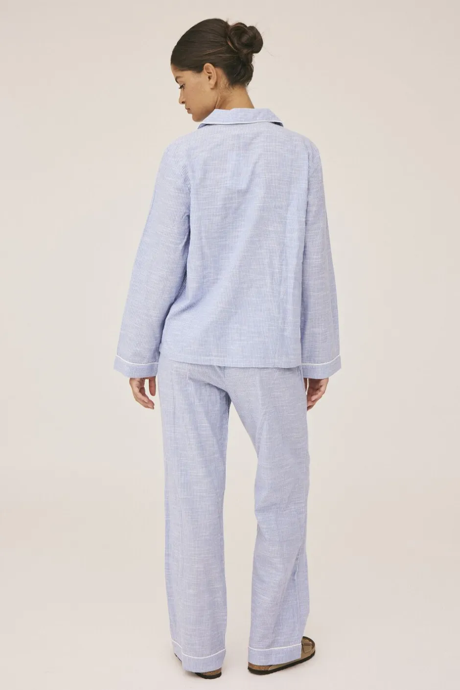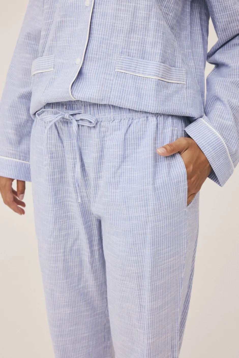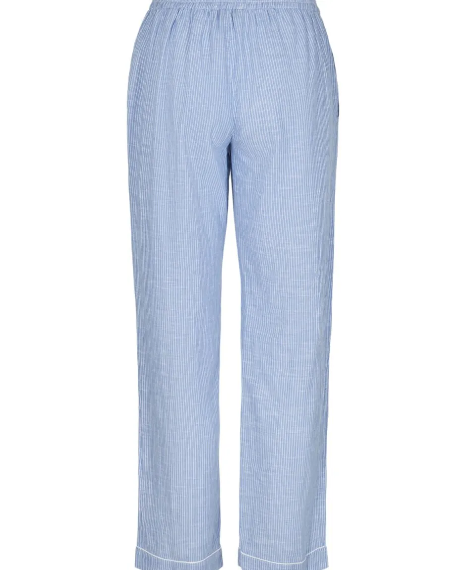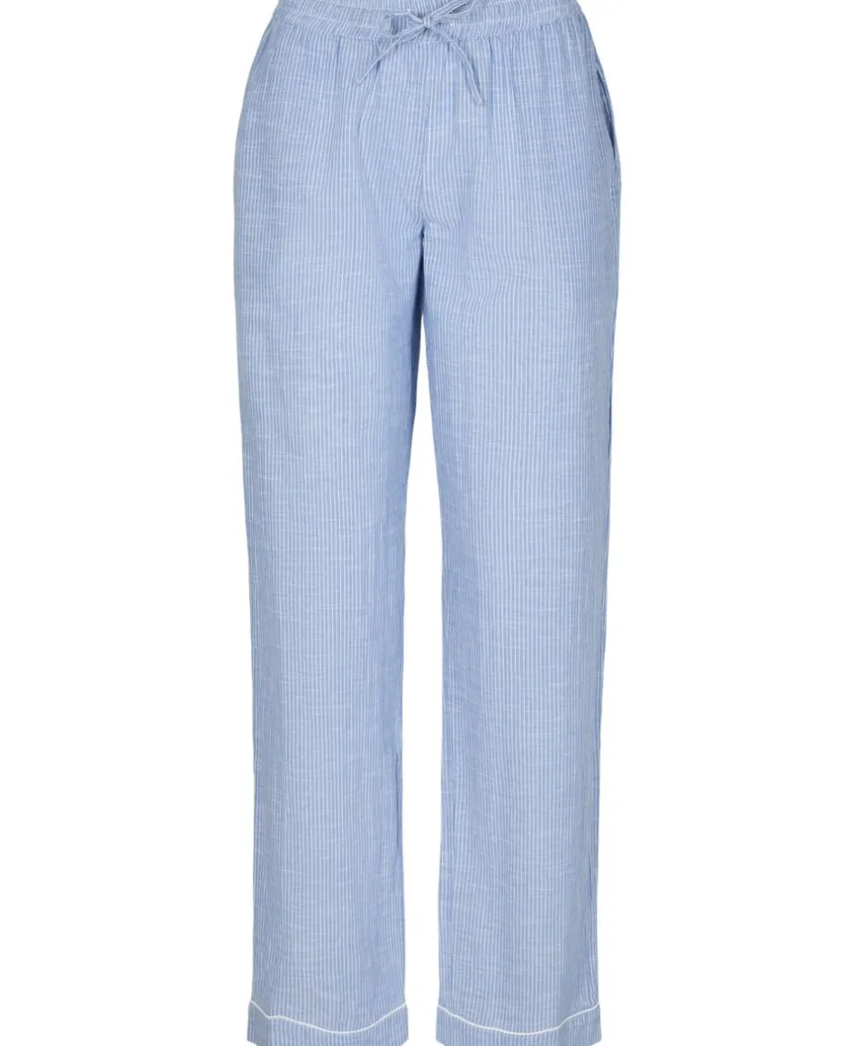 Bukser fra Magasin du Nord Collection i en blød og lækker 100% bomuldskvalitet med smalle striber. Bukserne har en løs pasform med elastik i taljen og bindebånd på fronten. Derudover har de praktiske lommer i siderne samt brede kanter forneden med pipingbånd. Kombiner dem fx med en overdel fra Magasin du Nord Collection for et komfortabelt og luksuriøst natsæt.
