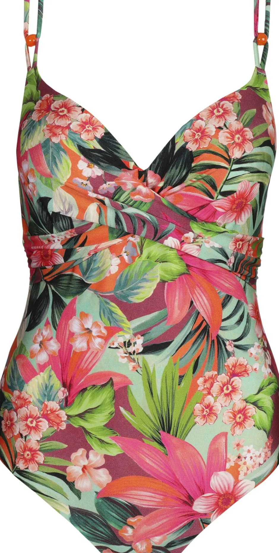 Sexet plunge-badedragt med komfortabelt polstrede skåle. En blød blanding af tropiske nuancer
