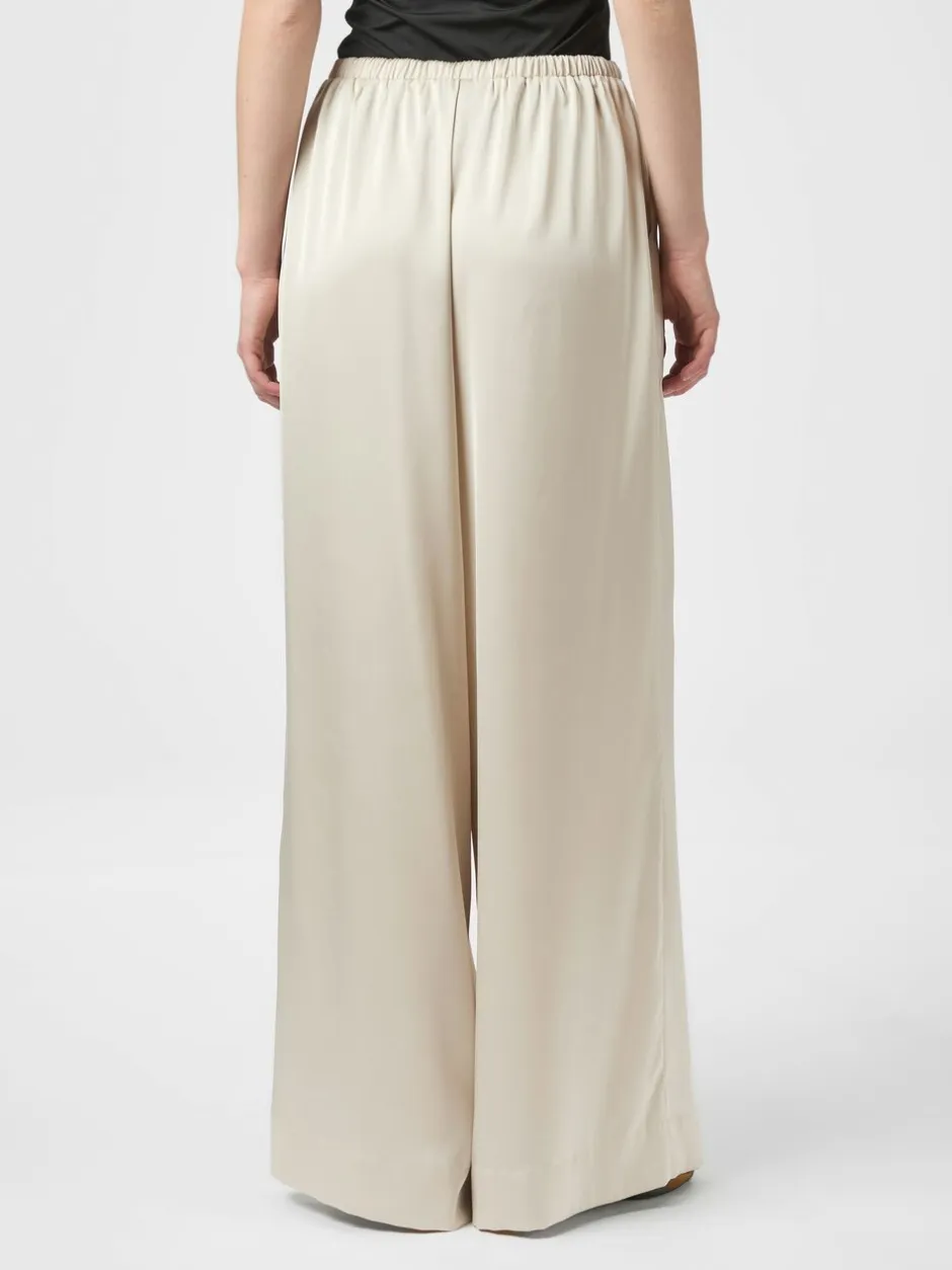 Satinbukser med brede ben. Bukserne har en mellemhøj talje, elastik og justerbare snører i taljen samt sidelommer. De har en almindelig pasform. Modellen er iført størrelse 36.