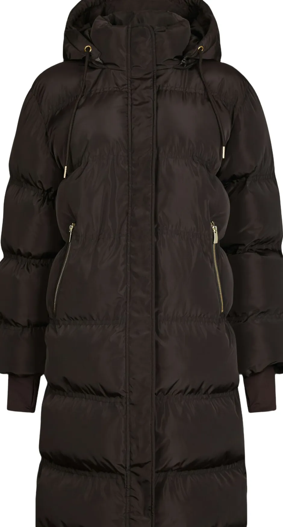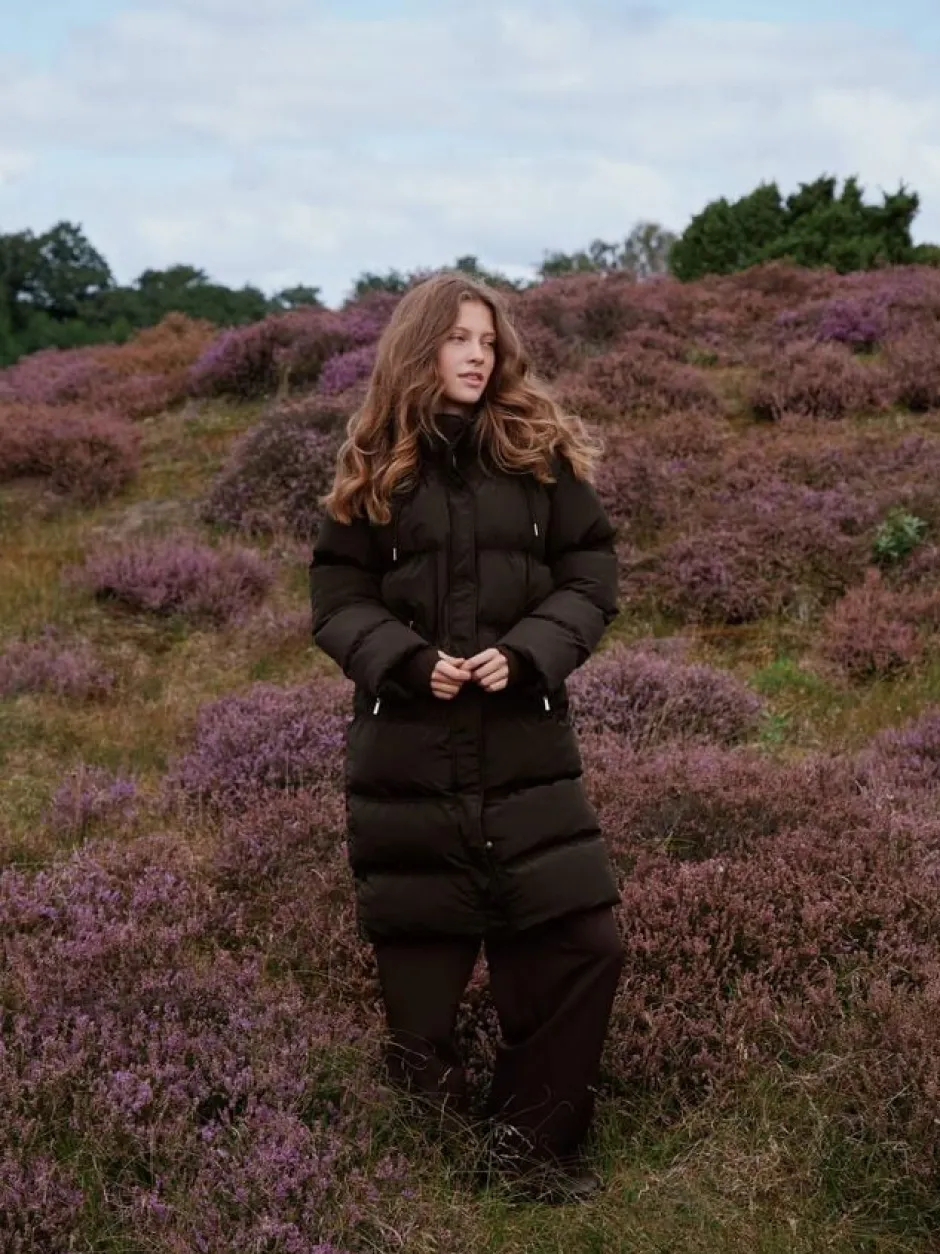 Lang, vatteret jakke med hætte. Jakken har en høj hals med aftagelig hætte, tovejs-lynlåslukning samt trykknapper og lange ærmer med vindfang. Den har forede sidelommer, der lukkes med lynlås. Pasformen er almindelig. Modellen er iført størrelse 36.