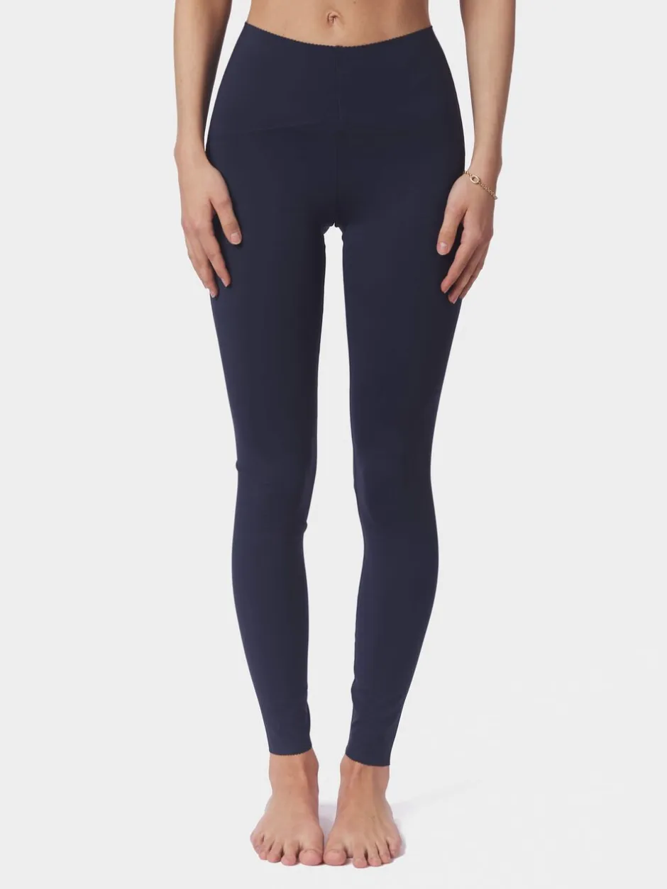 Højtaljede leggings med bølgekant i taljen. De er lavet i et materiale med stræk. Modellen er iført størrelse 36.