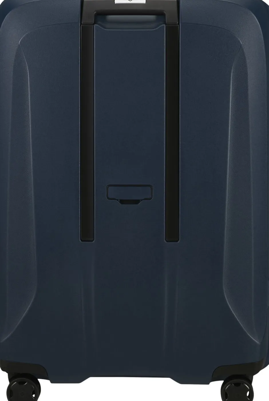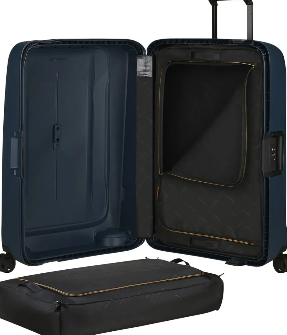 Kuffert med 4 hjul, lavet af minimum 70% genbrugt polypropylen, stoffet indvendigt er lavet af genbrugte pet flasker,3 punkts TSA lås, dobbelt trollystativ, 2 aftagelige pakkeposer, 4,2 kg,navneskilt,rumindhold 111 l, 5 års garanti 75x52x33 cm.