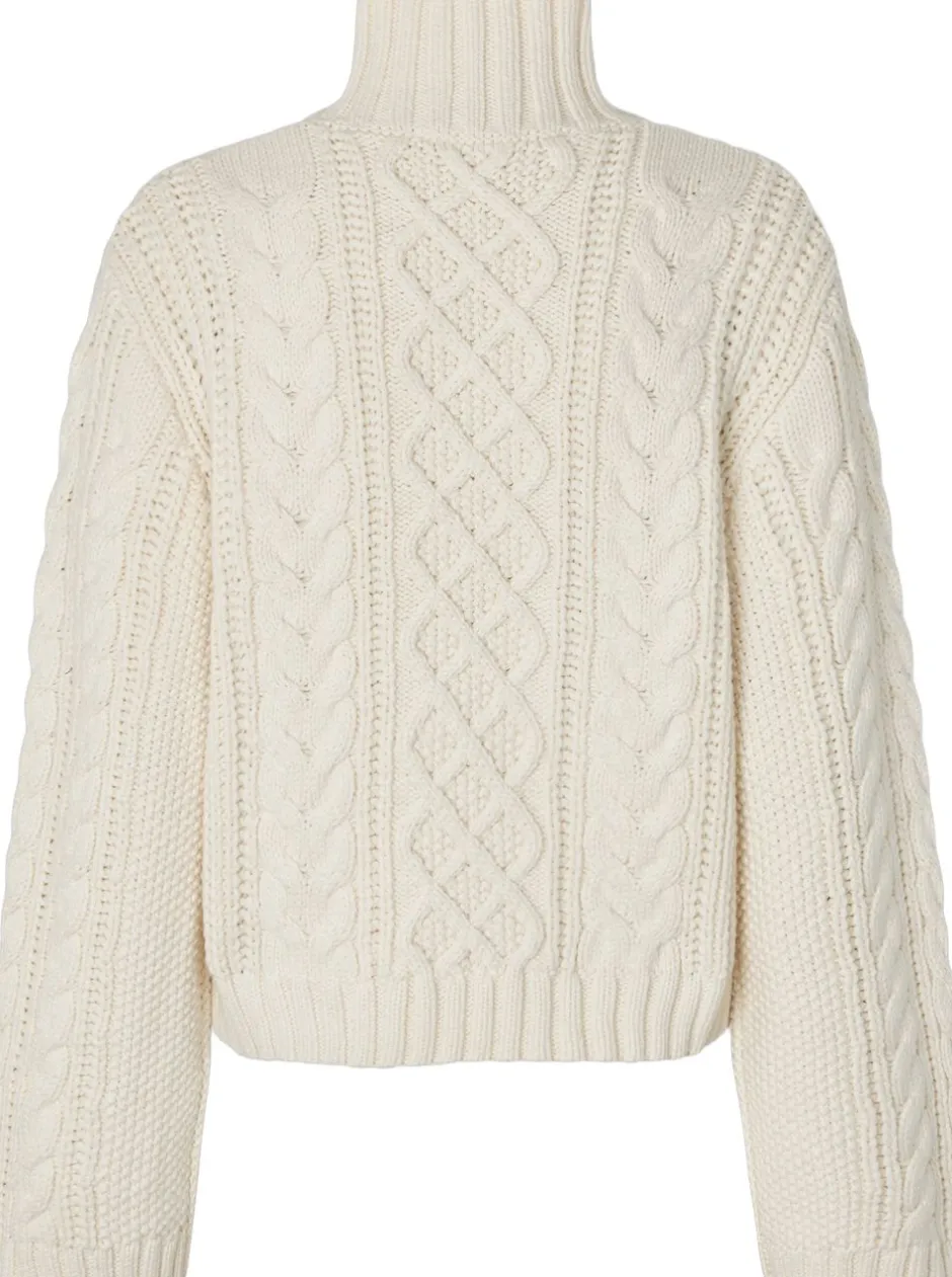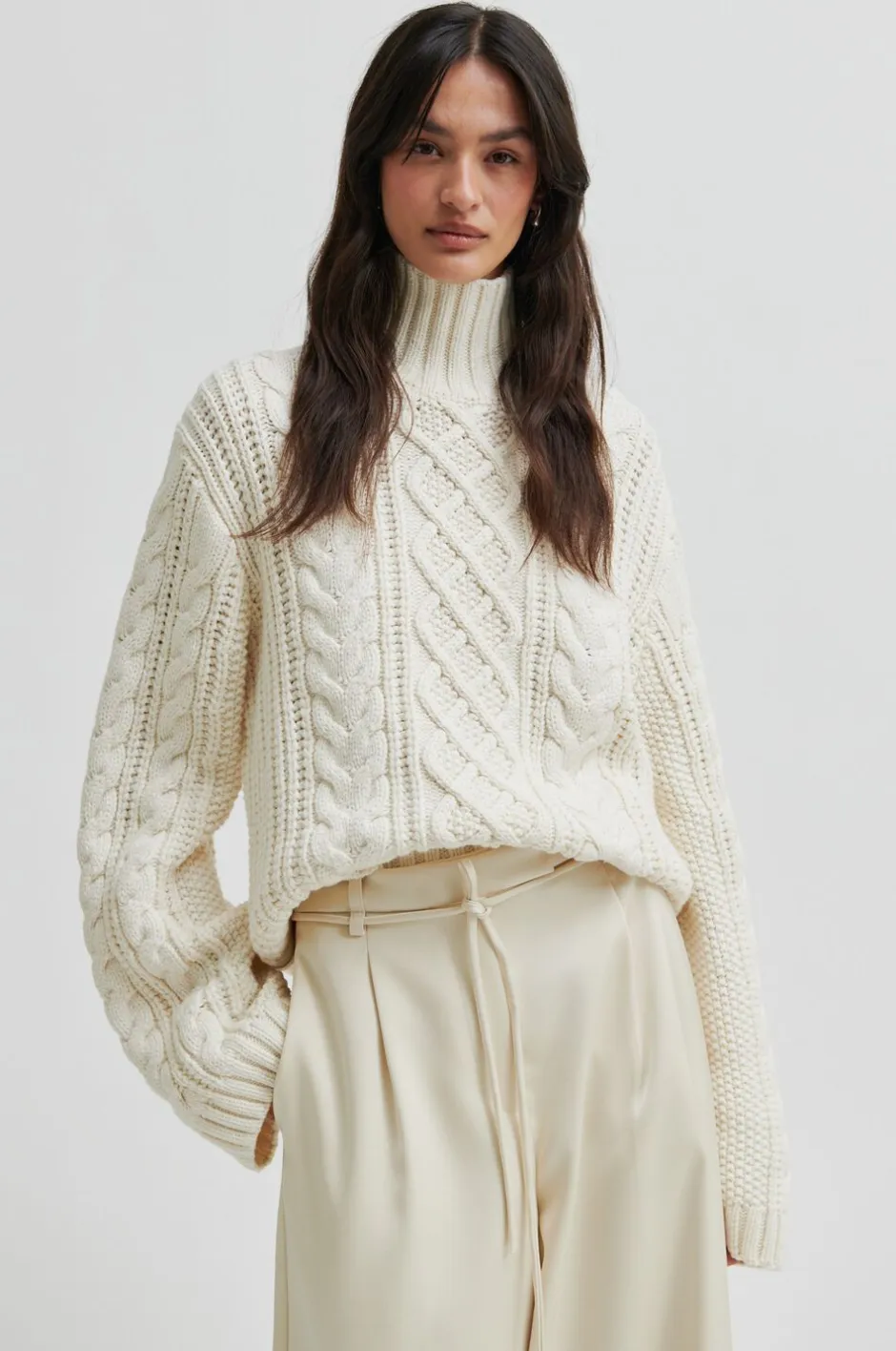 Second Female kabelstrikket pullover. Pulloveren er fremstillet i en blød bomuldsblanding med kraftig strik og kabeldetaljer. Med rullekrave og lange, vide ærmer. Ribkant ved hals, manchetter og forne