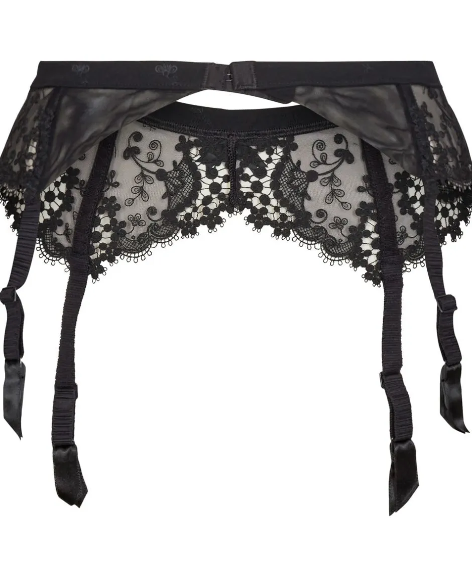 Broderet strømpeholder i tyl og satin jacquard.