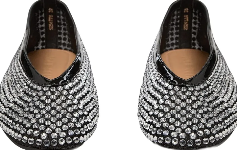• Meshballerina • Beklædt med rhinsten • Rund tå • Sort patent-look • Flad sål • 85% mesh, 15% læder