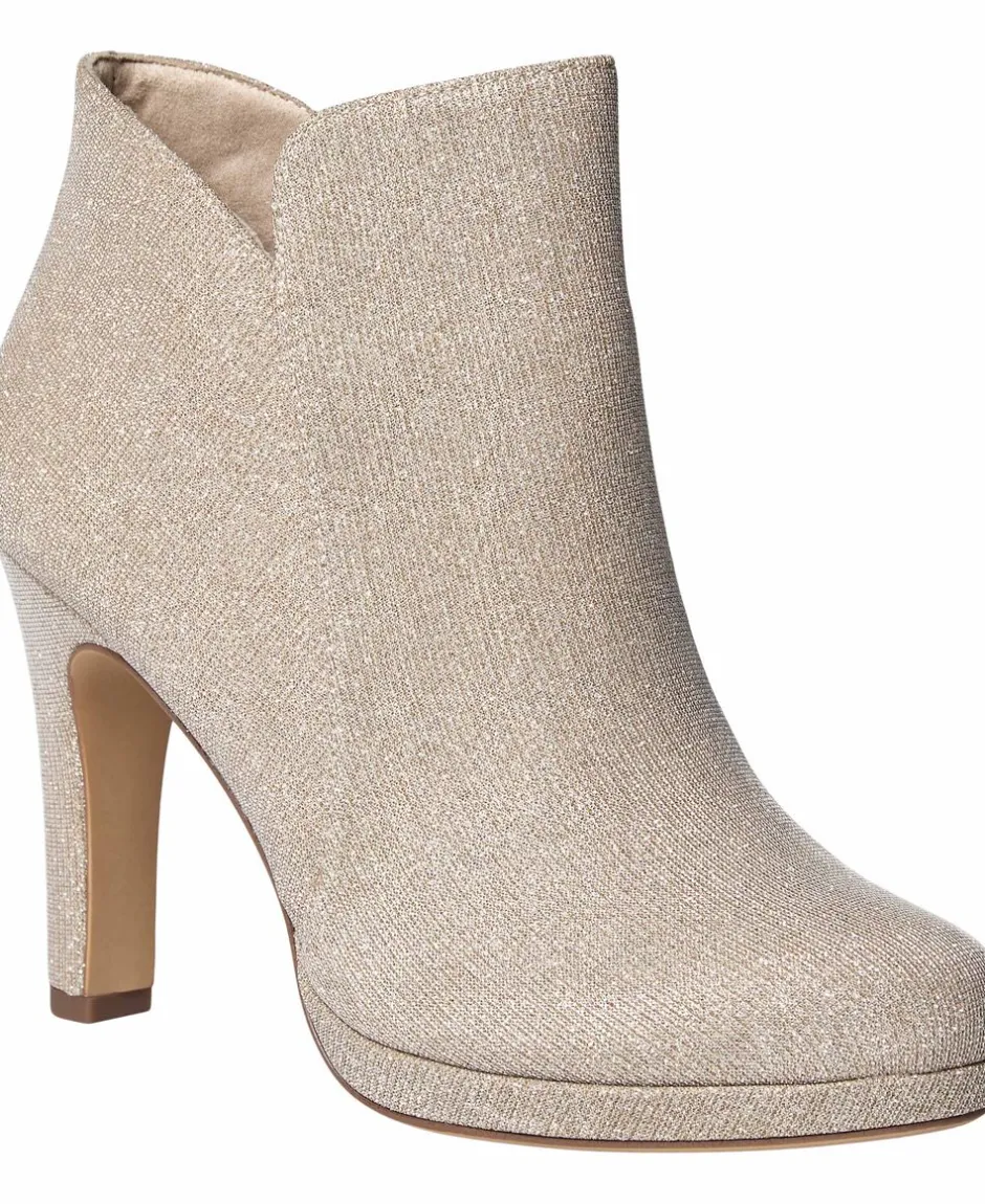 Party støvle i champagne farvet glitter materiale. Forfodsplatau og en hælhøjde på 95 mm. Skafthøjde er 9 cm og der er Touch it effekt i dæksålen