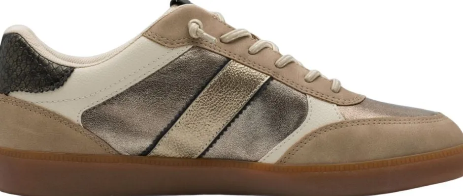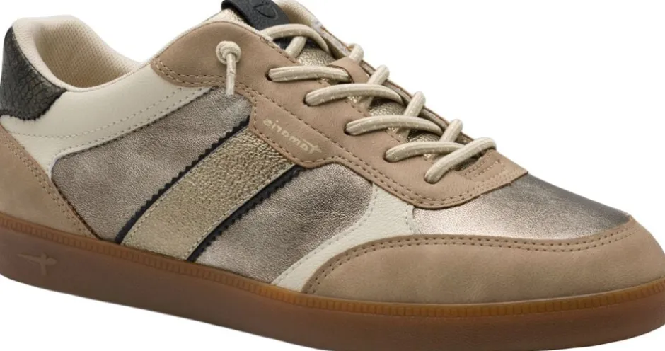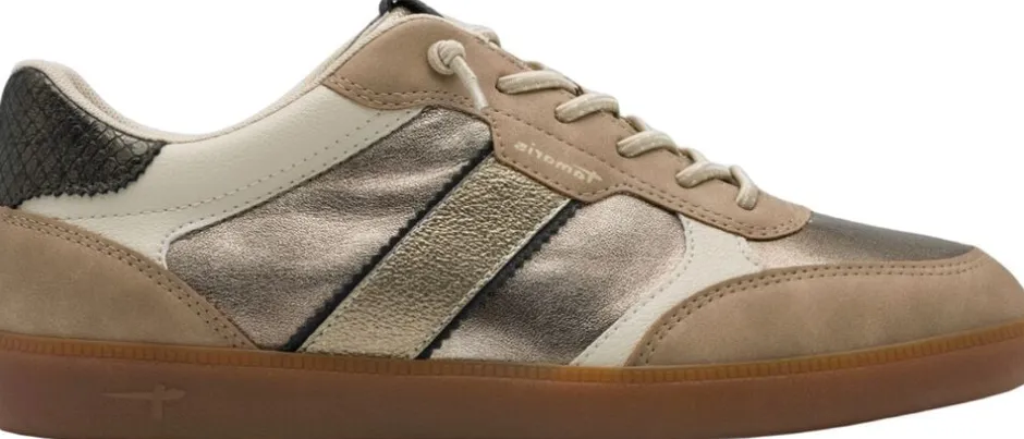 Beige sneaker med metallik detaljer og en naturfarvet gummisål. Snørrebånd er af elastik