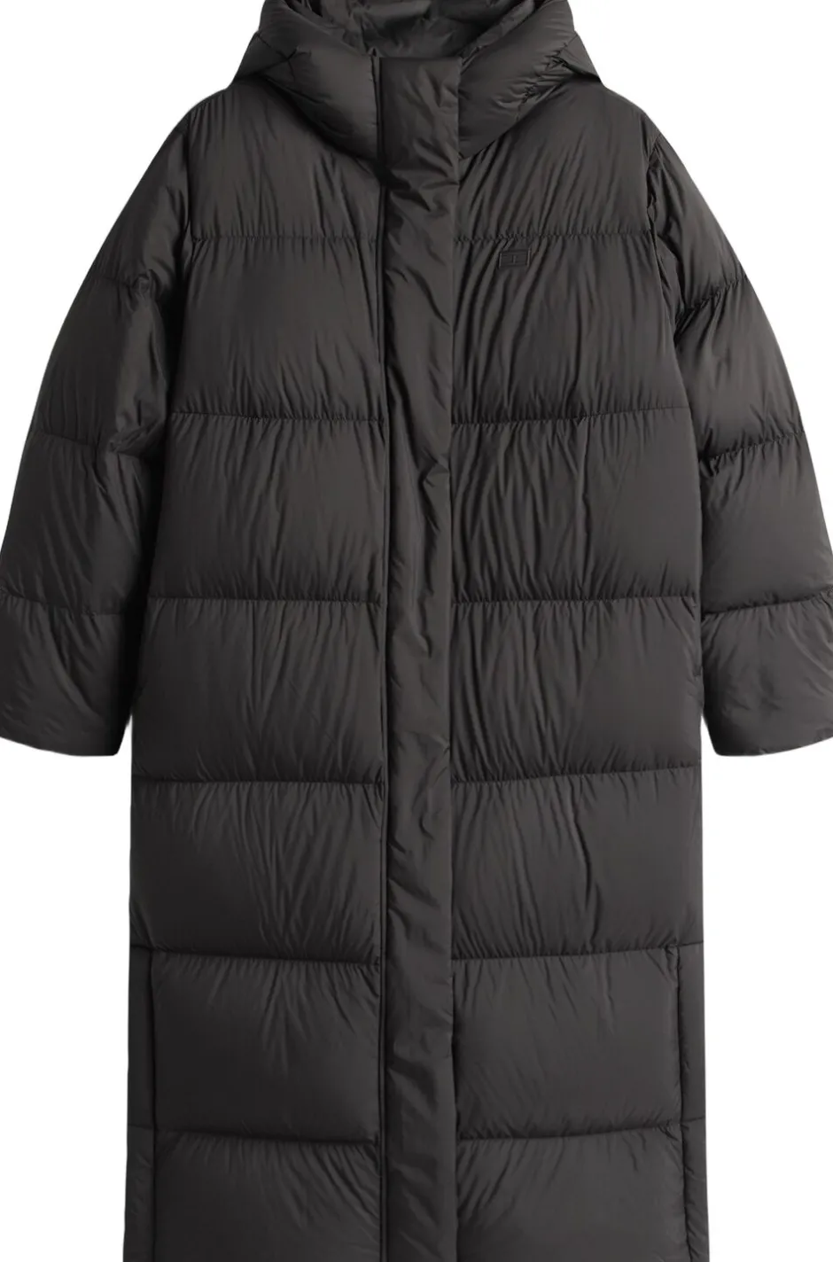 Denne dunfyldte pufferfrakke har en lang silhuet med en tætsiddende hætte og en vandafvisende finish for ekstra beskyttelse mod elementerne.