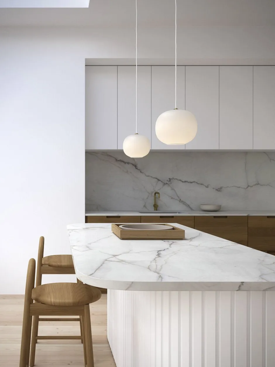 Navone er designet af den danske tegnestue Studio Mavro//Lefèvre by Sofie Lefèvre. Skærmens dominerende form er blød og rund, men den meget subtile buede bund tilføjer en ny interessant dimension, der forvandler lampen til mere end blot en kugle. Messingdetaljerne tilføjer et moderne touch og understreger lampens svævende lethed.