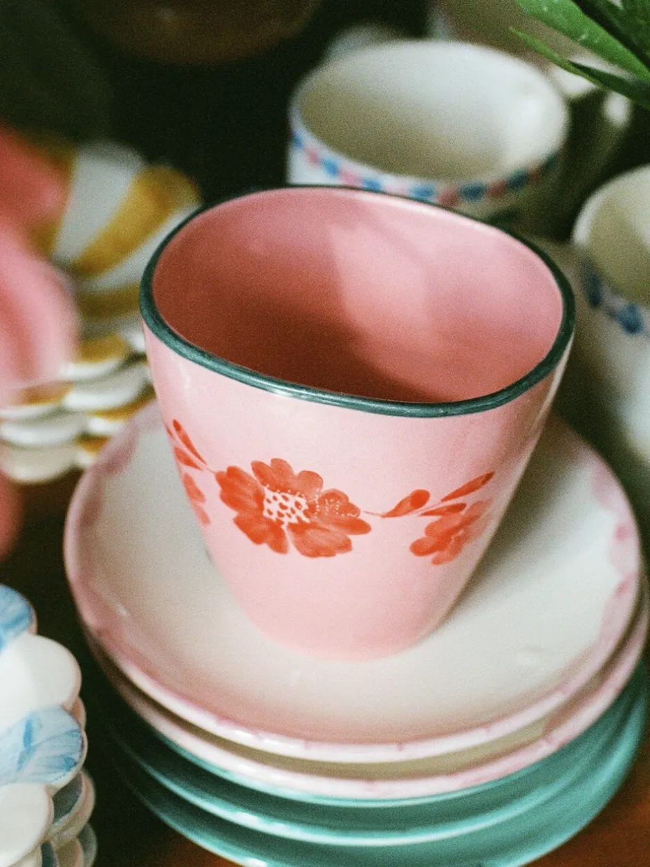 Start dagen med din morgenkaffe i dette ovale rosa krus af keramik med smukke, orange blomster. Koppen er håndmalet af en gruppe skønne portugisiske kvinder, hvilket gør hver enkelt kop helt speciel.