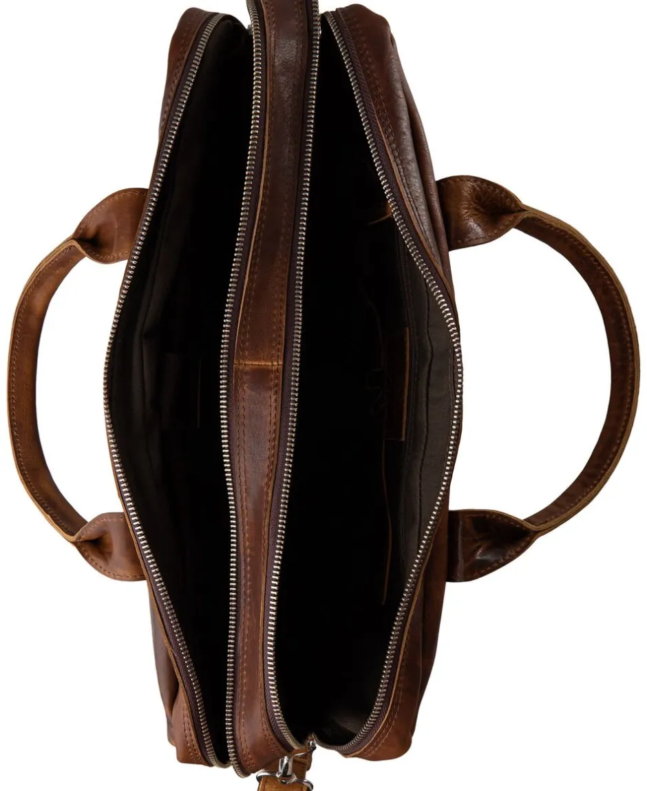 Axel i Catania skind fra Adax er en arbejdsmappe i kraftigt kalveskind og er inddelt i to hovedrum, der begge åbnes med lynlås. I det bagerste sidder en polstret PC-lomme og i det forreste finder du stiklommer, lynlåslomme samt plads til dine kuglepenne. Mappen har 2 polstrede bærehanke samt justerbar skulderrem. Vi anbefaler Adax læderbalsam samt Adax protections spray.