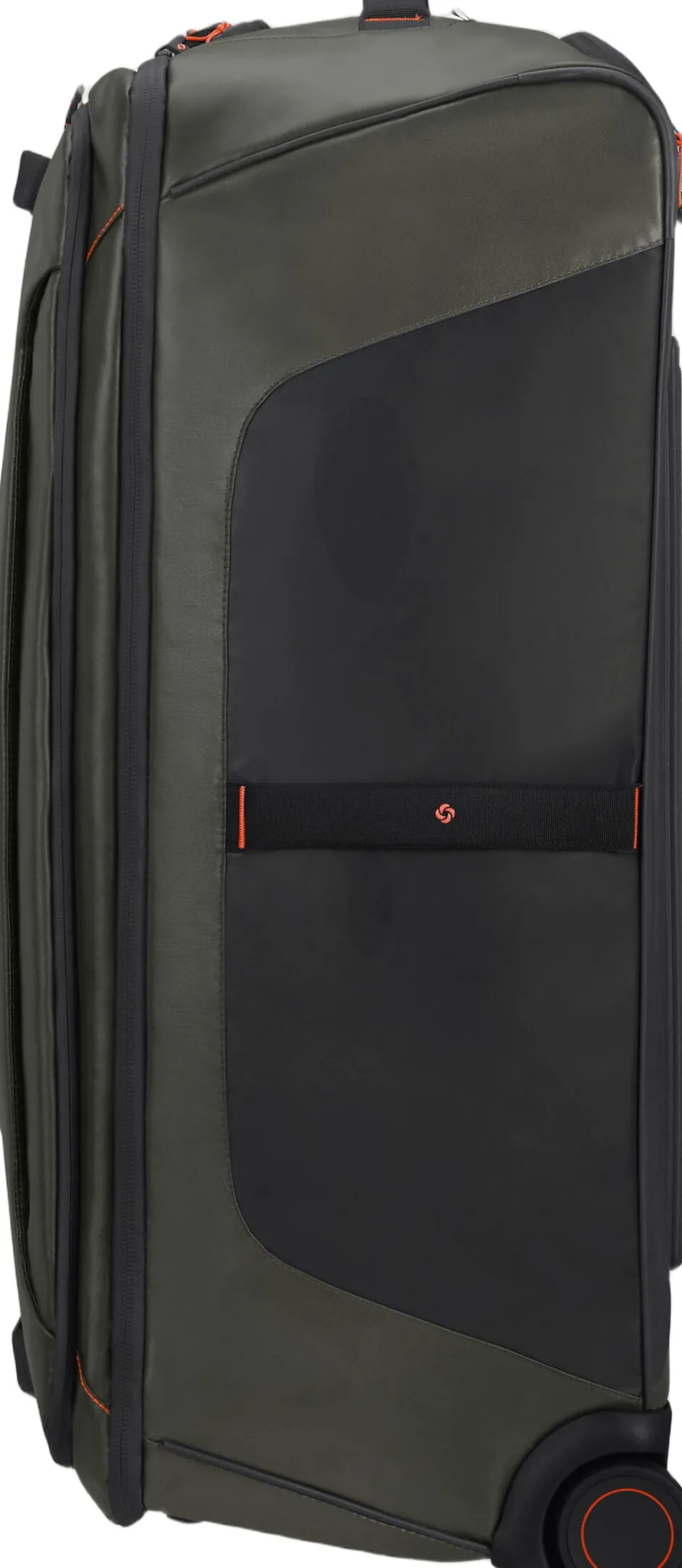 Duffle på hjul hvor både det udvendige og indvendige stof er lavet af genbrugt nylon og polyester, vandafvisende materiale, front og sidelomme, TSA lås, rumindhold 122 liter, vægt 3,4 kg. 5 års begrænset garanti.