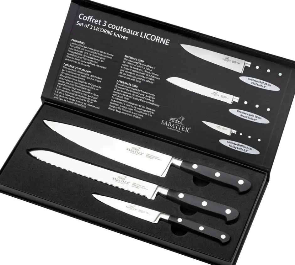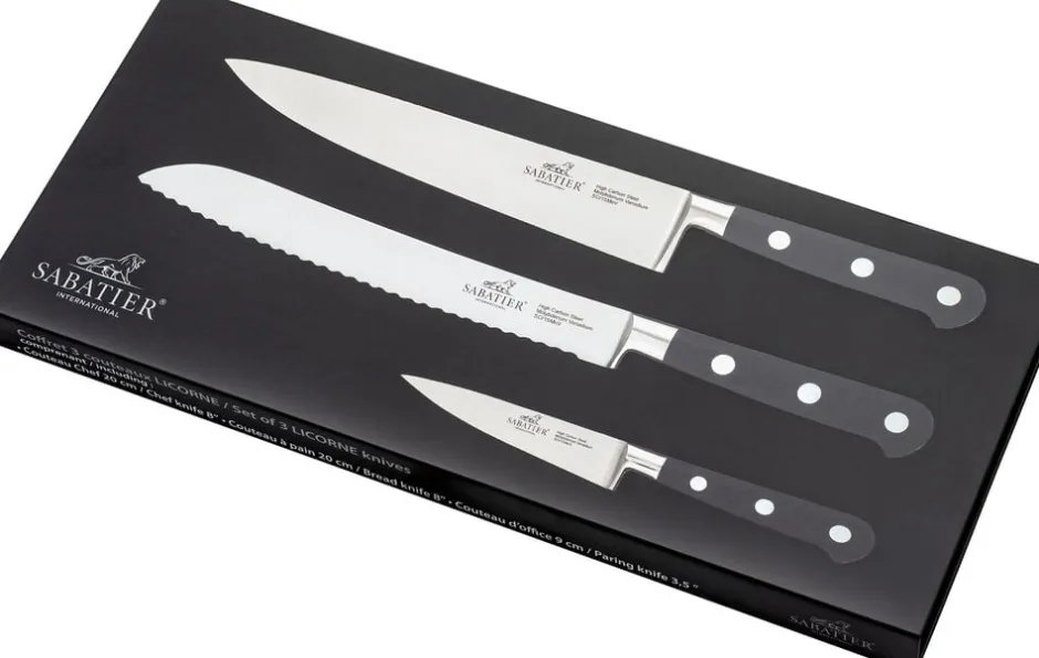 Licorne knivsæt bestående af 3 dele: Kokkekniv 20 cm, Brødkniv 20 cm, Urtekniv 9 cm.