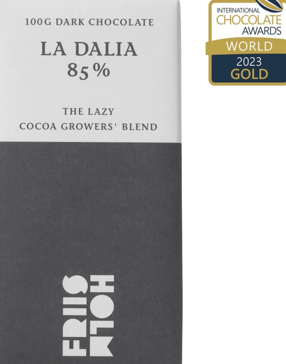 La Dalia 85 % er i samme serie som La Dalia 60 %, La Dalia 70 % og La Dalia 100 %. La Dalia 85 % er en meget syrlig chokolade med en mineralpræget karakter. De bærnoter, vi kan smage i La Dalia 60 % og 70 %, forsvinder, men til gengæld træder en anden type intens syrlighed frem, som bryder kakaointensiteten. Dette er præcis, hvad man ønsker i en chokolade med højt kakaoprocent, da det ellers kan blive meget intenst. Syrligheden løfter og letter på en måde chokoladen.