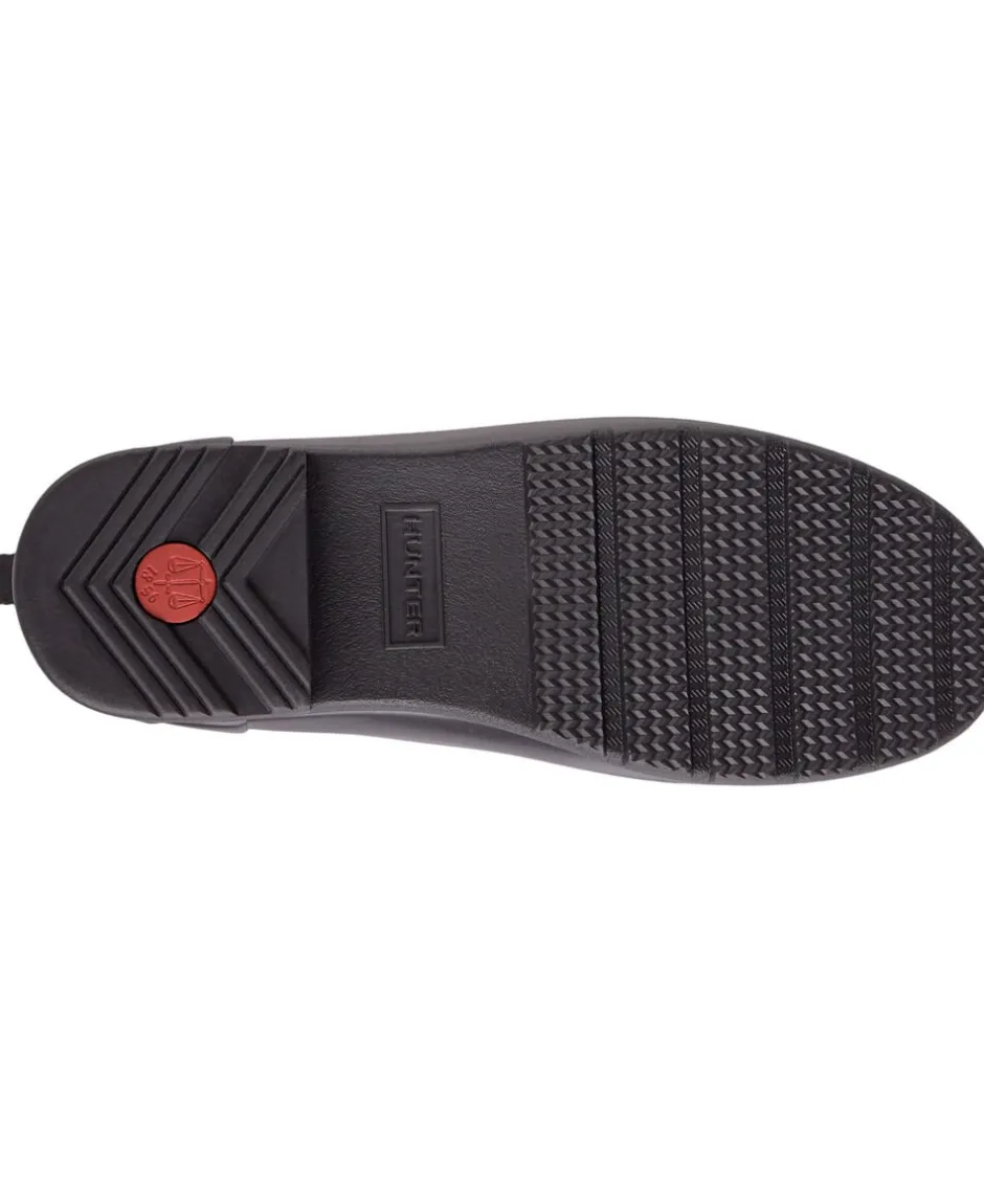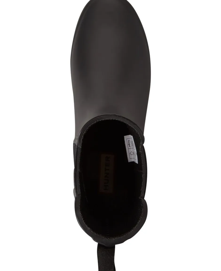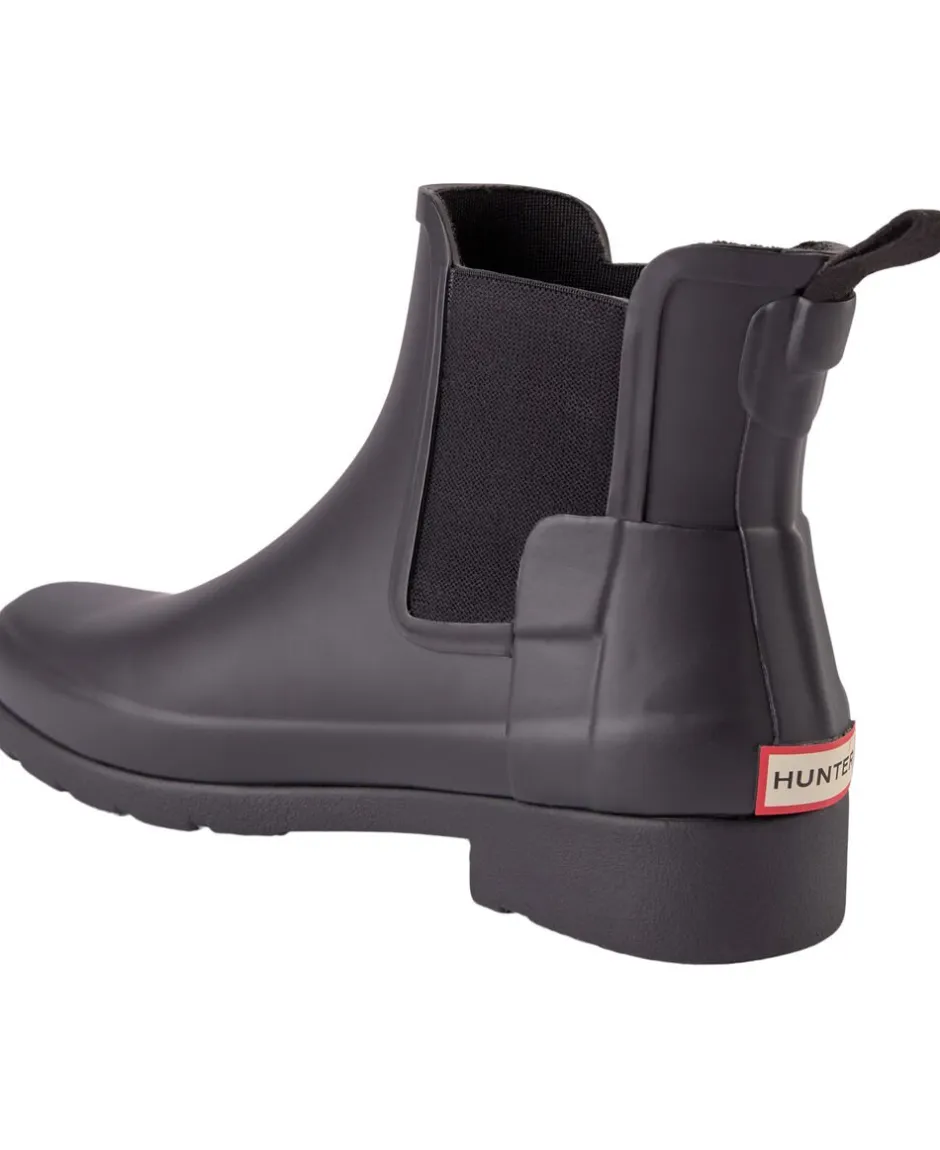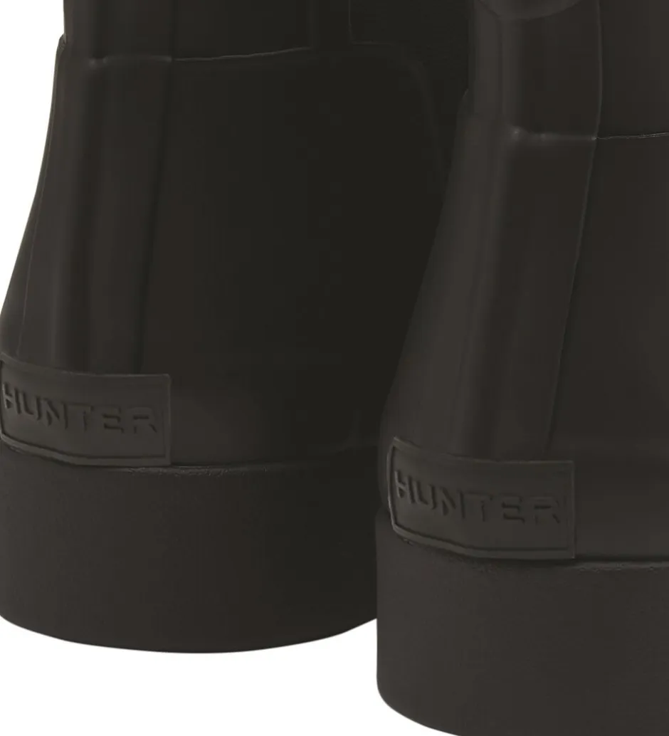 Kort gummistøvle fra Hunter i en smuk, mat kvalitet. Gummistøvlen har det klassiske ‘Chelsea’-støvle snit med elastikker i siderne, en afrundet snude samt en præget sål, der giver gummistøvlen et chunky udtryk.