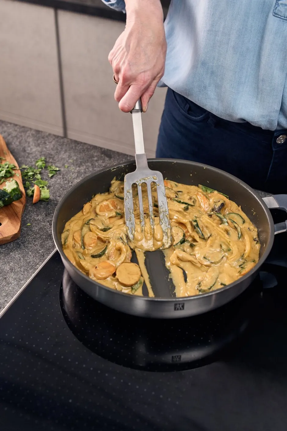 Fremragende ydeevne møder fremragende håndtering! Oplev madlavning på et nyt niveau med ZWILLING Simplify stegepande. Vores næste generation af CERAFORCE® Matte keramisk slip let-belægning gør det muligt at stege med mindre fedt, så du får sundere måltider. Den er fremstillet uden PFAS og er op til tre gange mere holdbar end vores tidligere keramiske belægning*. Panden har også vores SIGMA Classic sandwich-bund med jævn varmefordeling for mere effektiv stegning ved lave temperaturer. Desuden er vores stay-cool-håndtag ergonomisk udformet og belagt med silikone, så det er køligt og behageligt at holde på, mens du steger. Takket være det brede design kan du placere dine køkkenredskaber på det og holde din arbejdsflade ren.