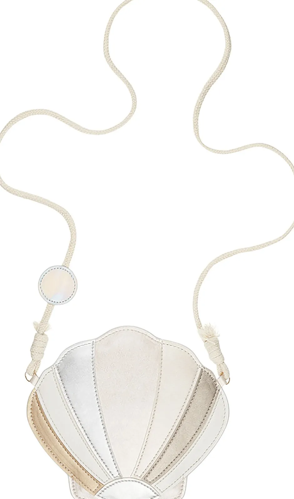 Smuk skuldertaske formet som en muslingeskal i fine lyse pastelfarvet.