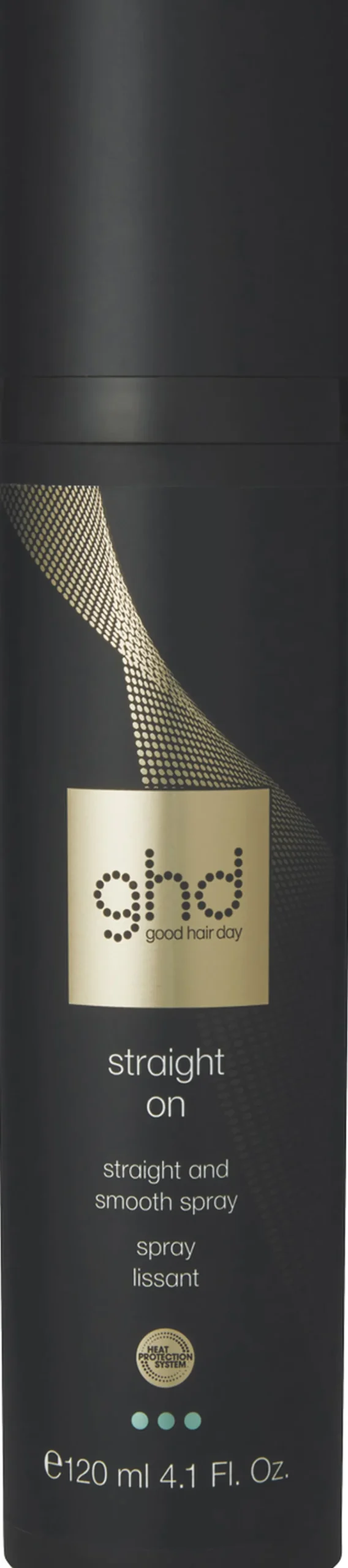 ghd Straight On – glattende og bldgrende spray til superglat finish og sundt resultat. F det bedste ud af din varmestylingrutine med ghd straight On Spray. Dette lette og usynlige hrprodukt udglatter straks hret, med det ultimativt resultat, nr det bruges sammen med dit glattejern. Giver glat hr til nste dag og lngere kontrol af krus, 8/10 er enige*. ghd straight on spray er dit helt ndvendige produkt til glat hr. Indeholder det unikke ghd varmebeskyttende system med dobbeltvirkning fra beskyttende polymerer og plejende stoffer til udglatning af hrets overflade og beskyttelse mod skade. ghd straight on spray styrker og glatter hrfibrene med professionelt slutresultat. ghd straight on hrstylingspray er velegnet til alle hrtyper og fungerer sammen med din styler med professionel glat finish og maksimal kruskontrol. *Forbrugertest, 100 kvinder vs. deres normale stylingprodukt, september 20.
