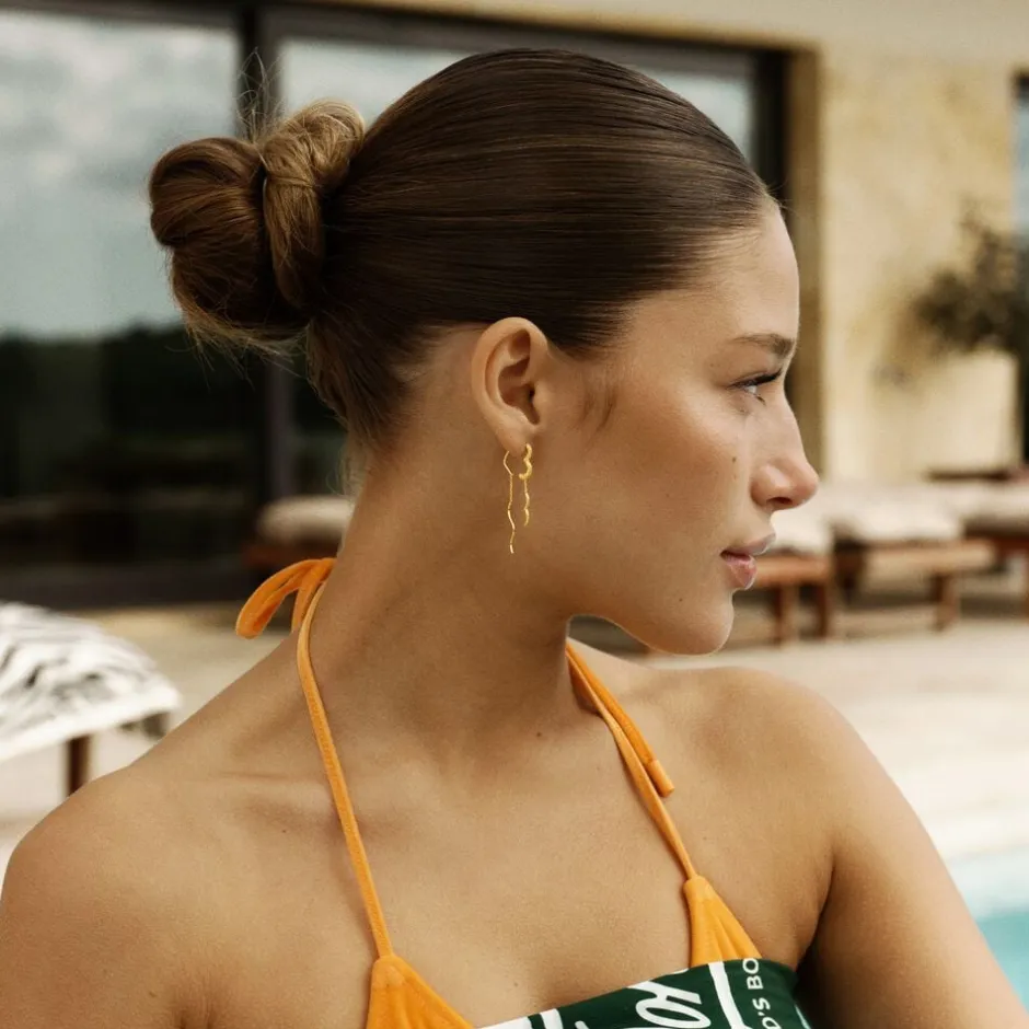 Set fra siden danner earlinen et blødt hjerte, mens frontstykket leger med wavy links, der fanger lyset fra alle vinkler. Den organiske tekstur møder en højpoleret overflade, hvilket skaber en elegant kontrast og et udtryk, der føles både edgy og sofistikeret.