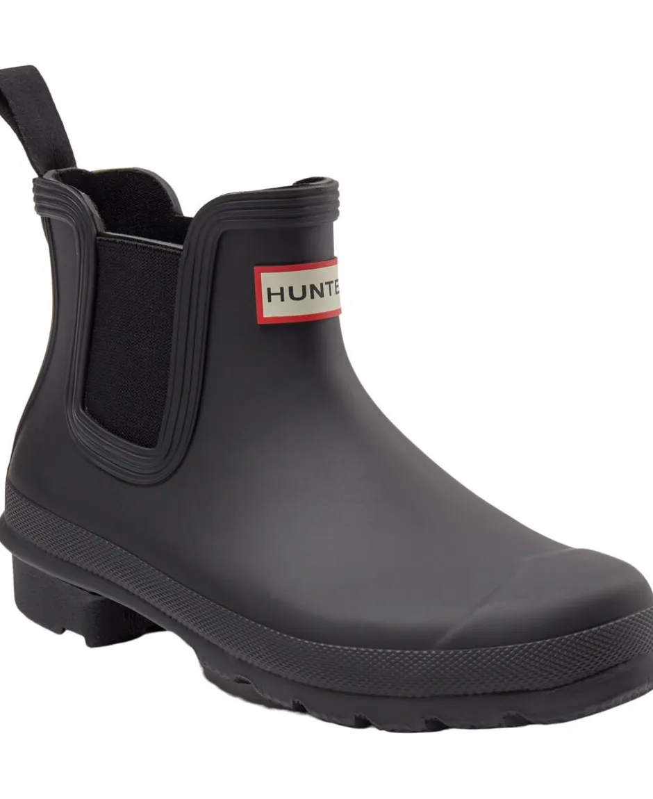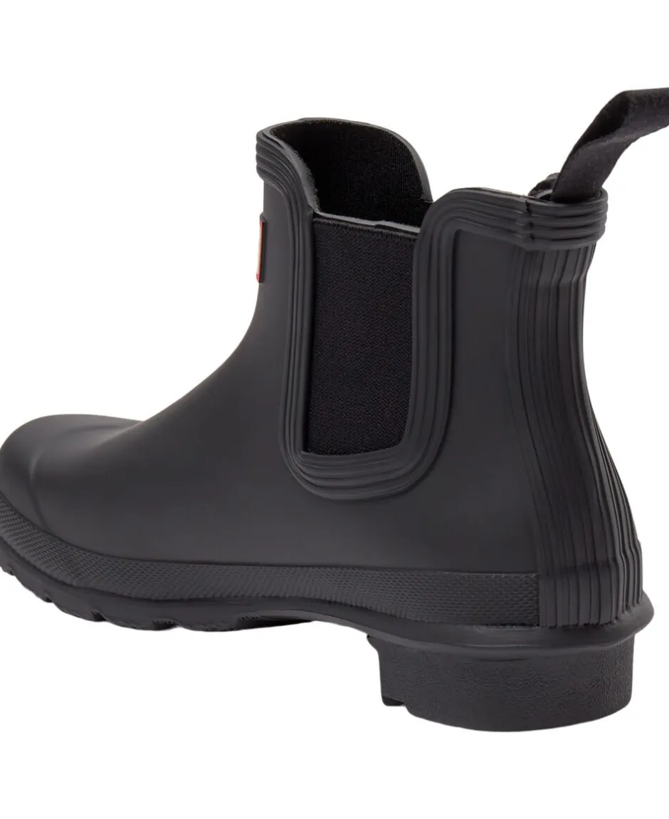 Kvindernes originale chelseastøvle. Støvlen er håndlavet med naturligt vulkaniseret gummi og en mat finish. Gummiydersålen har det originale Hunter-mønster. Den har en elastisk sidekile og en nylon-trækstrop til østlig fodindgang. Foret er af Recycled polyester. Vandtæt.