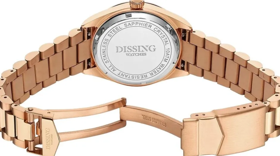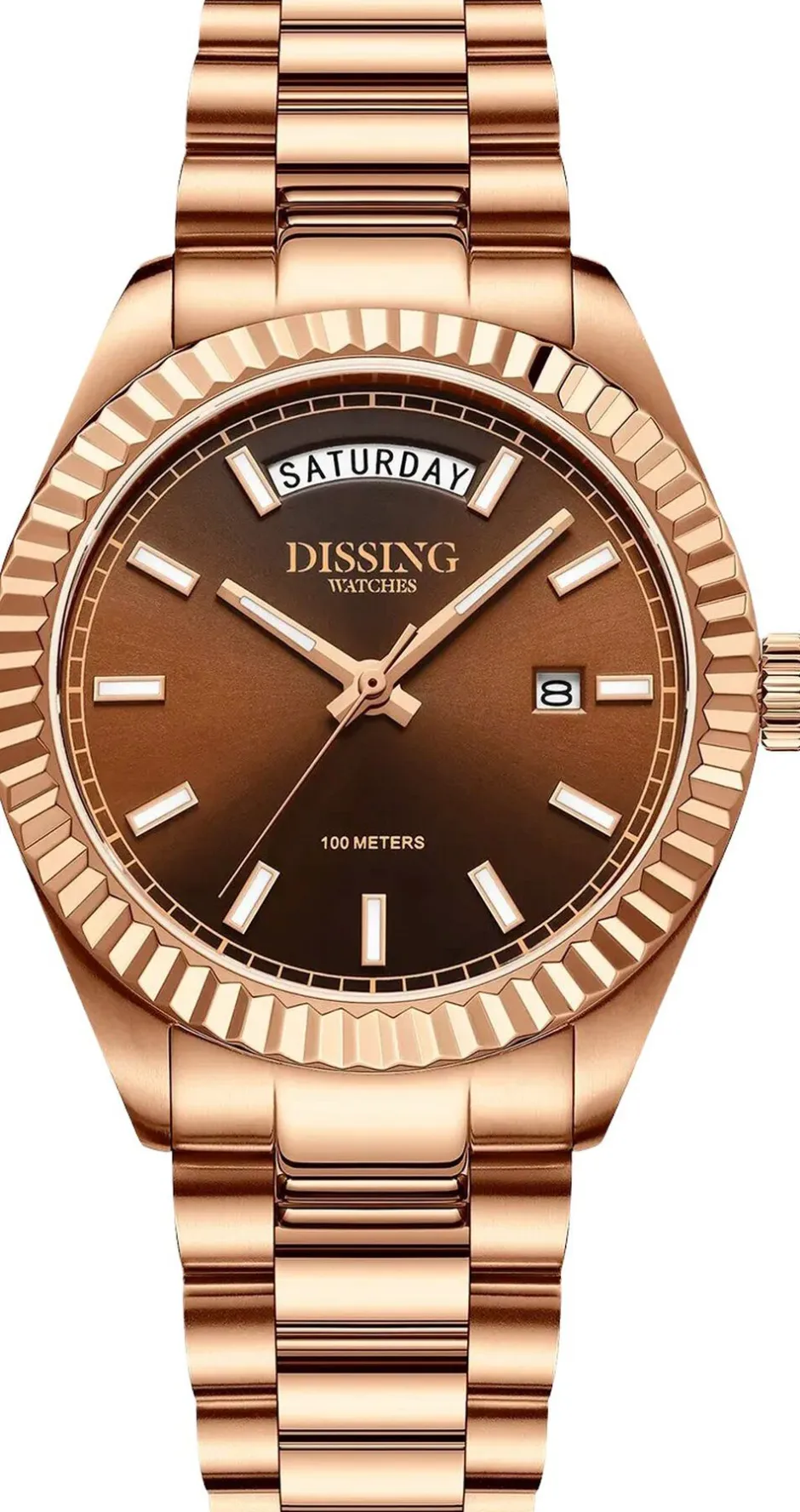 Dissing Day Date D1725 uret kombinerer klassisk stil med praktisk funktionalitet. Det har en rund urkasse med en rillet bezel, der indrammer den brune urskive og giver det et karakteristisk udtryk. Dag- og datovisningen er placeret øverst, mens et mindre datovindue sidder på højre side. Rektangulære timemarkører og matchende visere forbedrer det samlede design. Uret er udstyret med kvarts urværk.