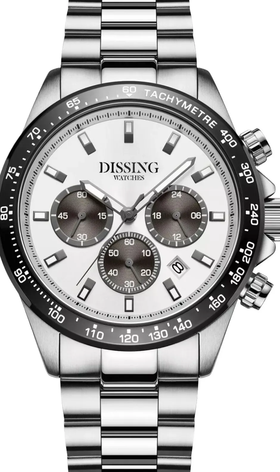 Dissing MK9 D1583 er et imponerende ur fra Dissing MK9 kollektionen, der har en rund urskive med tre kronografer, der tilføjer dybde til designet. Urskiven er hvid, indrammet af en sort bezel markeret med et tachymeter, hvilket giver det et sporty udseende. Med en diameter på 43 mm gør uret et stærkt indtryk på håndleddet, mens den sølvfarvede urkasse og stål-lænke giver et klassisk og robust look.