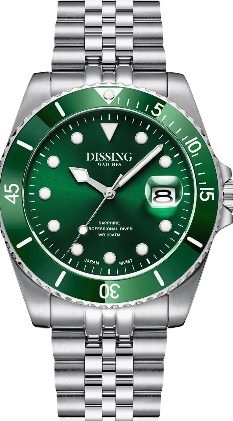 Dette dykkerur har en stål-lænke, der øger dets holdbarhed. Den imponerende grønne urskive suppleres af en matchende grøn bezel, mens den sølvfarvede urkasse og lænke giver en elegant kontrast. En foldelås sikrer uret komfortabelt på håndleddet. Med en diameter på 43 mm gør dette ur et markant indtryk på håndleddet og er vandtæt op til 20 ATM, hvilket gør det velegnet til dykkeroplevelser.
