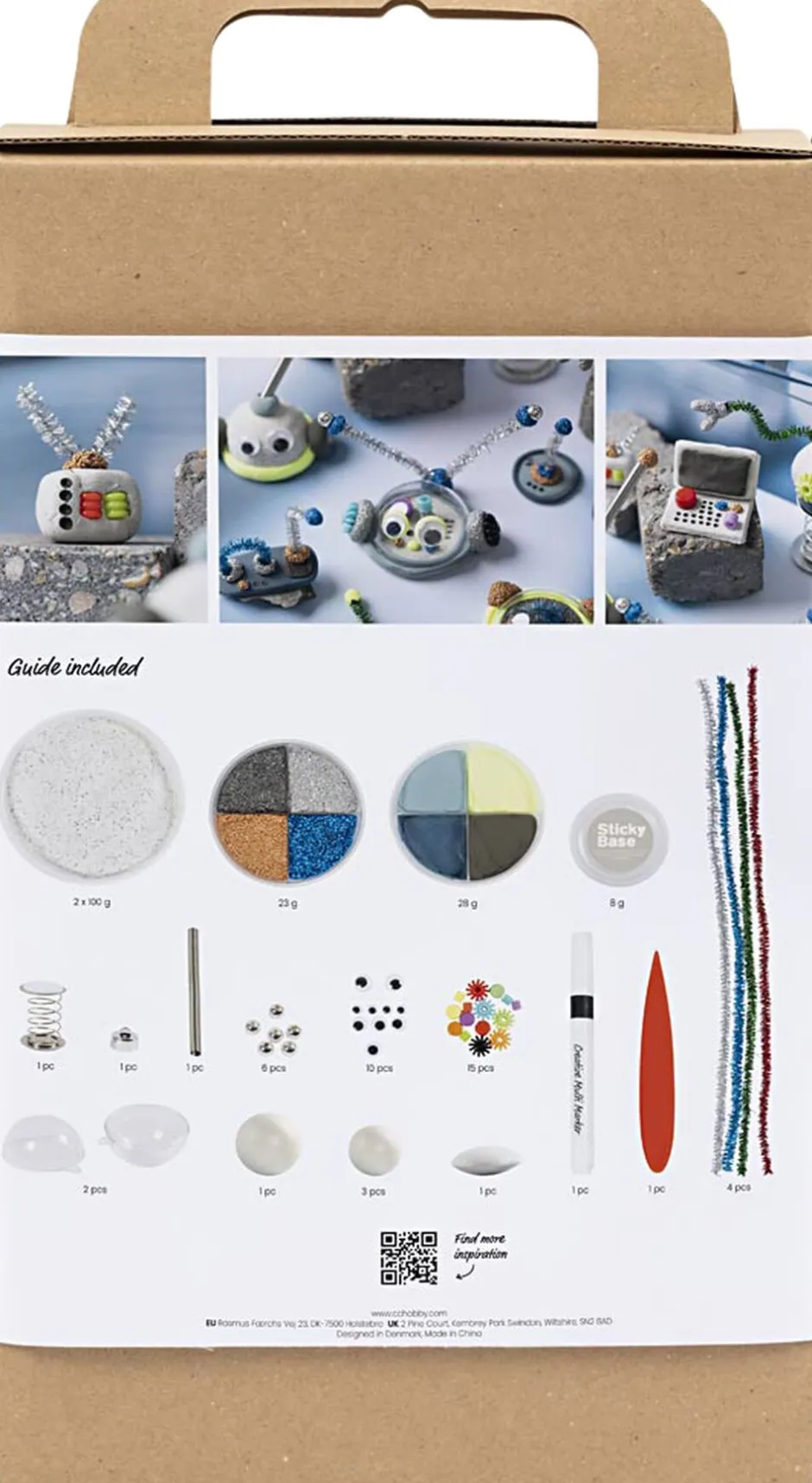 Med vores Creativity in a Box kan du og dine børn bygge de sejeste robotter i Stone Clay og Silk Clay®. Alt, hvad I skal bruge, er inkluderet og vi giver jer masser af inspiration til at komme godt i gang. Mange børn elsker robotter og nu kan I nemt skabe jeres egne derhjemme. Åbn vores Creativity in a Box, og byg et helt univers med robotter, der rocker. Fyld dem med fjedre, antenner og andre dingenoter, som I selv laver og se, hvordan deres personlighed skinner frem. I kan også forme sjove detaljer i Silk Clay® og Foam Clay®. Måske store øjne, sjove næser eller farverige fødder? Brug inspirationen som følger med, eller snak om, hvordan robotter egentlig ser ud dine børn har sikkert masser af idéer, I kan bruge.
