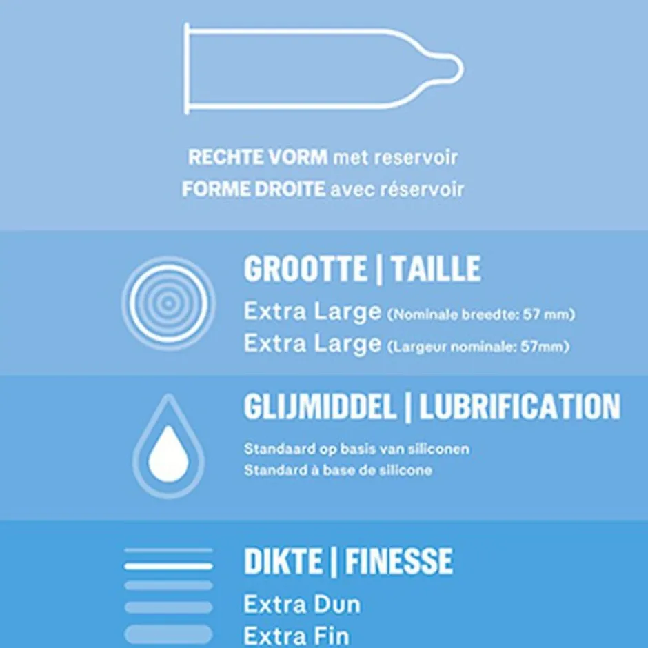 Durex Condoms Nude Extra Large gives the real skin-on-skin sensation. Thanks to the ultra-fine texture, these ultra-thin condoms offer maximum sensations and a high level of safety and protection. These ultra-thin condoms are made of latex and contain a silicone-based lubricant. The condoms are easy to apply.