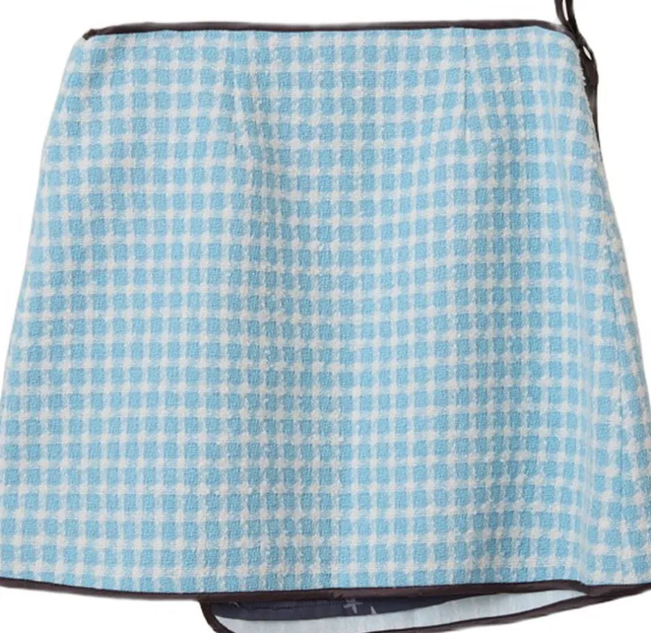 Ella Mini-nederdelen har et raffineret hvidt og blåt bouclé-stof, suppleret med en mørkebrun foring for diskret kontrast. Designet til at være vendbar, nederdelen afslører en nat-sky stjerne print på den anden side. Dens alsidighed gør den til et perfekt match til ethvert outfit. Med en afslappet pasform og dens wrap-funktion kan du justere pasformen, så den passer til dine ønsker