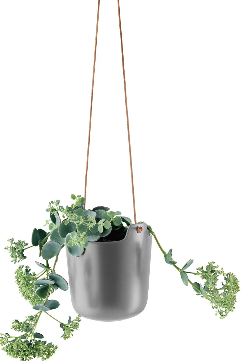 Selvvandende, dekorative urtepotter i mat stentøj og med lædersnor til ophæng. Et organisk design, som med urtepottens selvvandende system giver de optimale vækstbetingelser for krydderurter og blomster. Ved hjælp af nylonvæger i bunden af den øverste potte og et vandreservoir i den nederste potte kan planten selv suge den mængde vand, den har brug for. Planteindsatsen i plast er udformet med en vandingskanal, der gør den nem at påfylde.