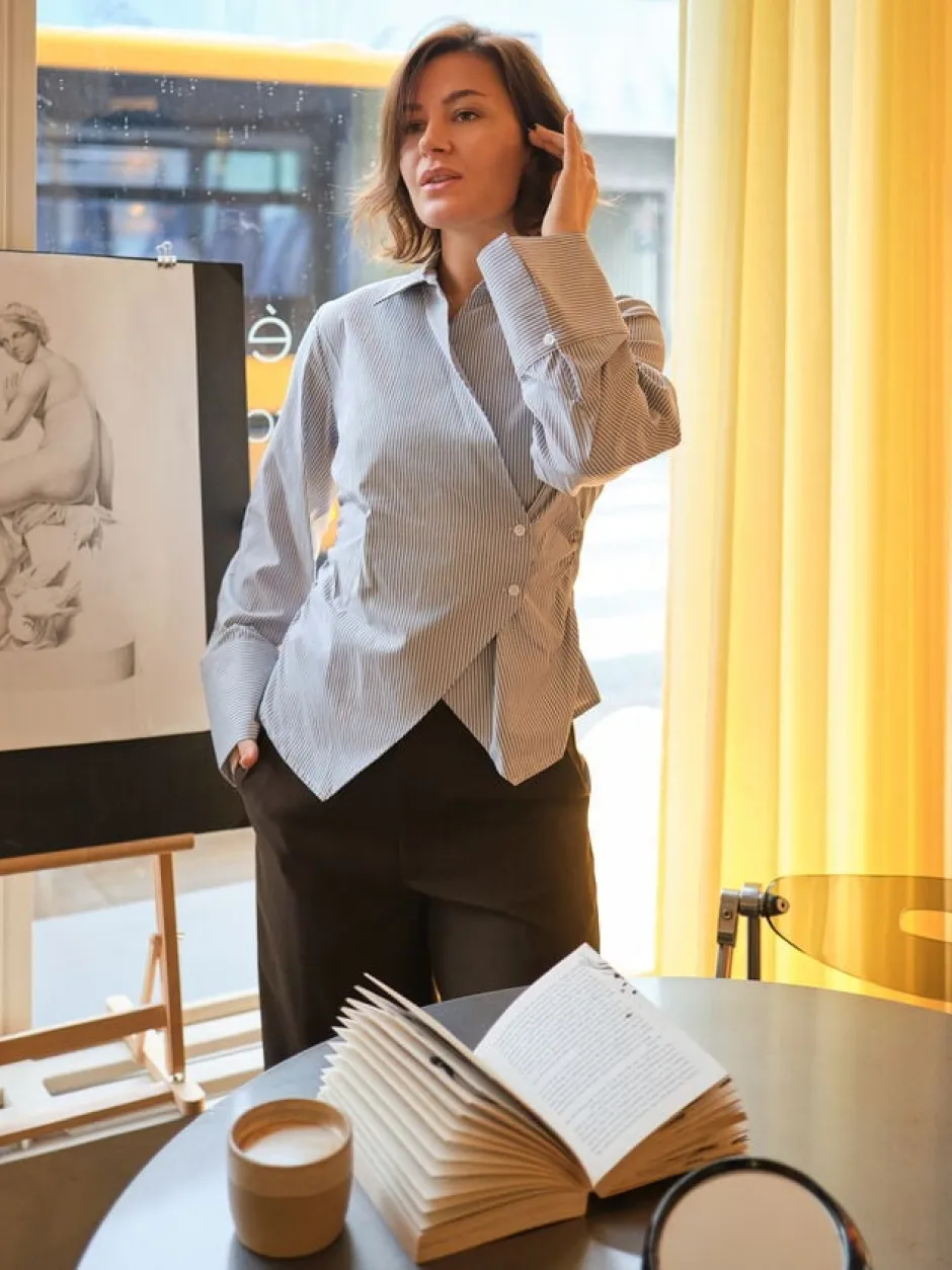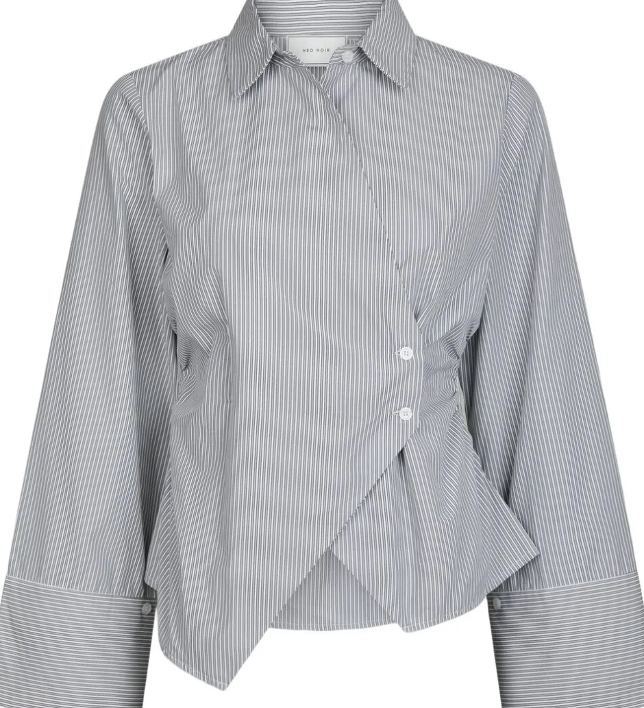 Stribet skjorte med asymmetrisk lukning. Skjorten har en klassisk krave, lange ærmer med brede manchetter og rynkedetaljer i siden. Den lukkes med to knapper i siden og har en slids foran. Materialet er en bomuldsblanding, og den har en almindelig pasform. Modellen er iført størrelse 36.
