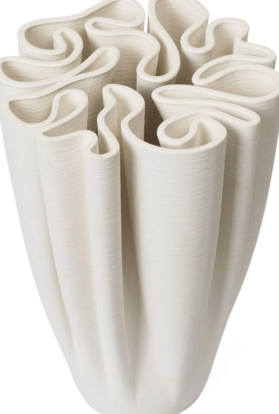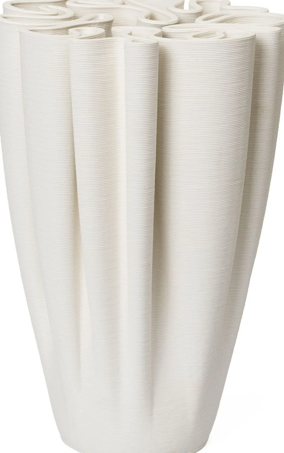 Dedali-vasen er en fusion af kunst og nytte, og dens form minder om de detaljerede mønstre i en labyrint, der på fransk kaldes “dédale”. Den labyrintlignende top er skabt af 3D-printet keramik og er ikke kun æstetisk tiltalende, men også funktionel til at arrangere blomster i en voluminøs Ikebana-stil.