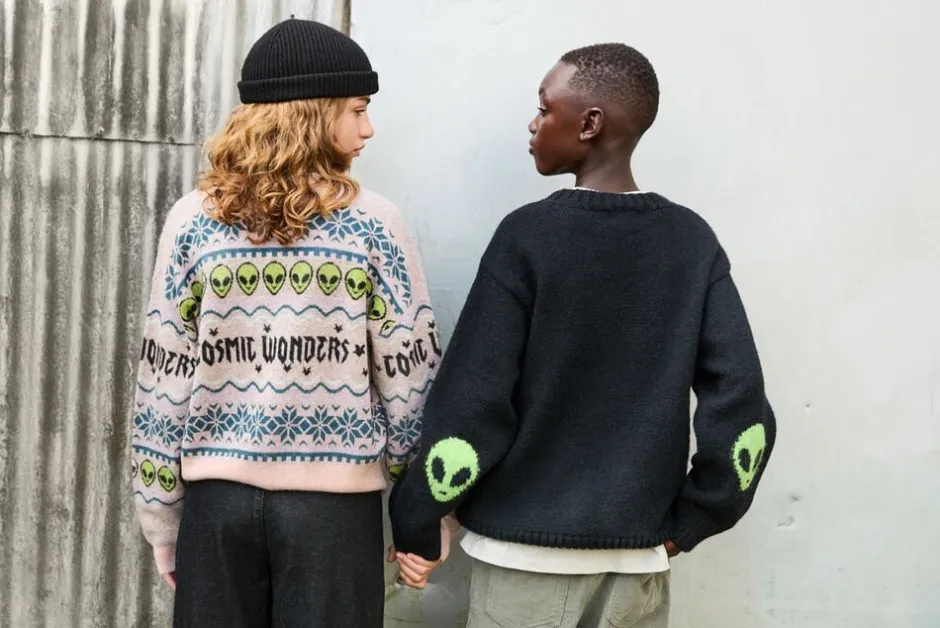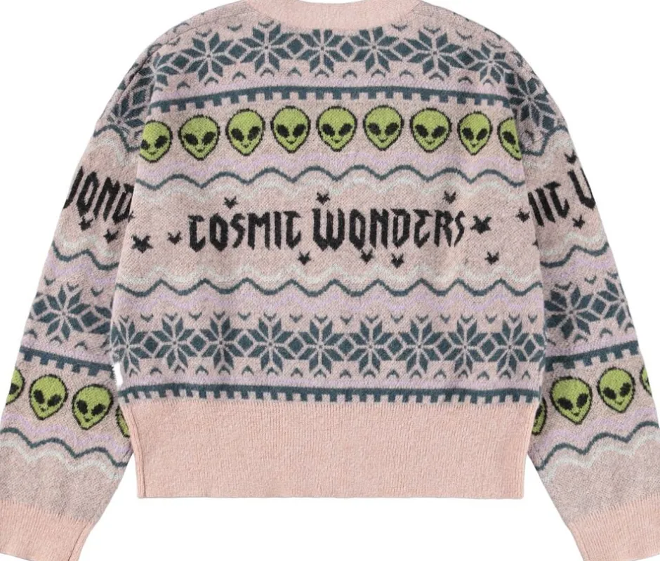 Denne flotte cardigan fra Molo er lavet i en blanding af uld og alpaka. Den har et farvestrålende mønster inspireret af nordisk strikkehistorie med små alien og teksten ‘Cosmic Wonder’. Cardiganen har V-udskæring, ribafslutning og fine knapper foran.