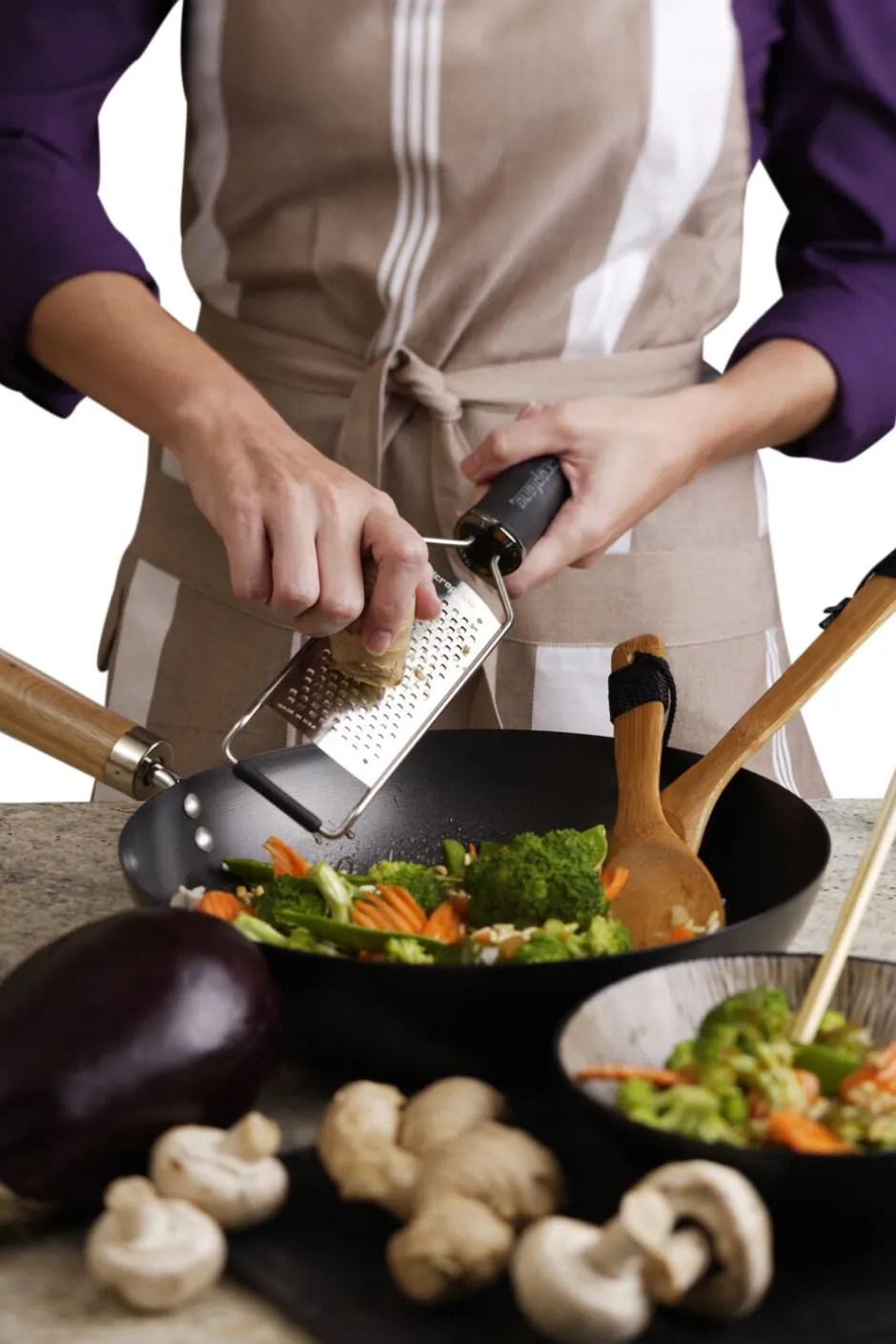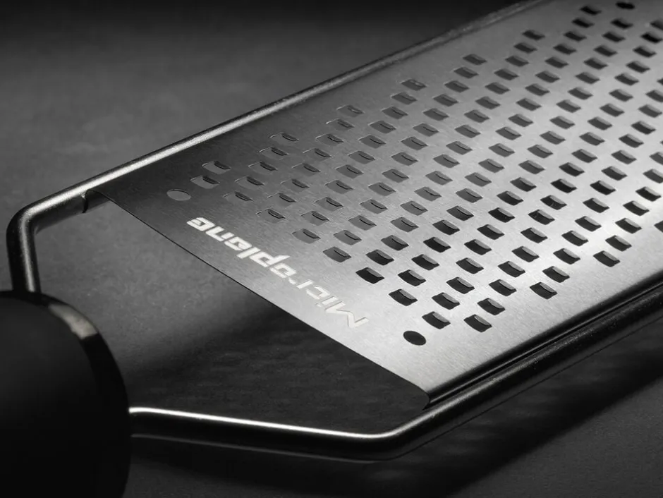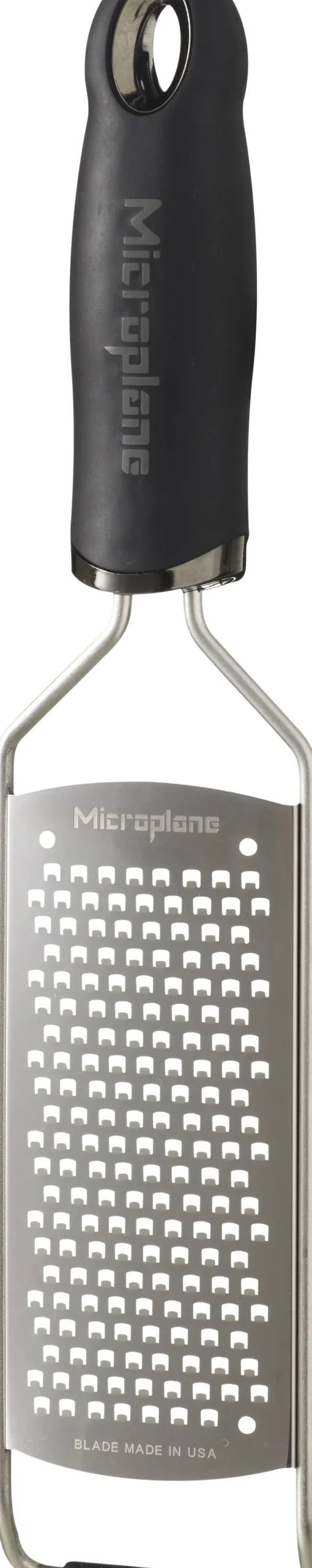 Microplane Gourmet rivejern med groft skær er et af 7 forskellige rivejern i Microplane Gourmetserien. Rivejernet har skridsikkert greb og fod, samt fotoætsede barberbladsskarpe skær der holder sig skarpe og snitter sig igennem maden på fineste vis. Velegnet til f. eks chokolade, peberrod, løg, muskat m.m.