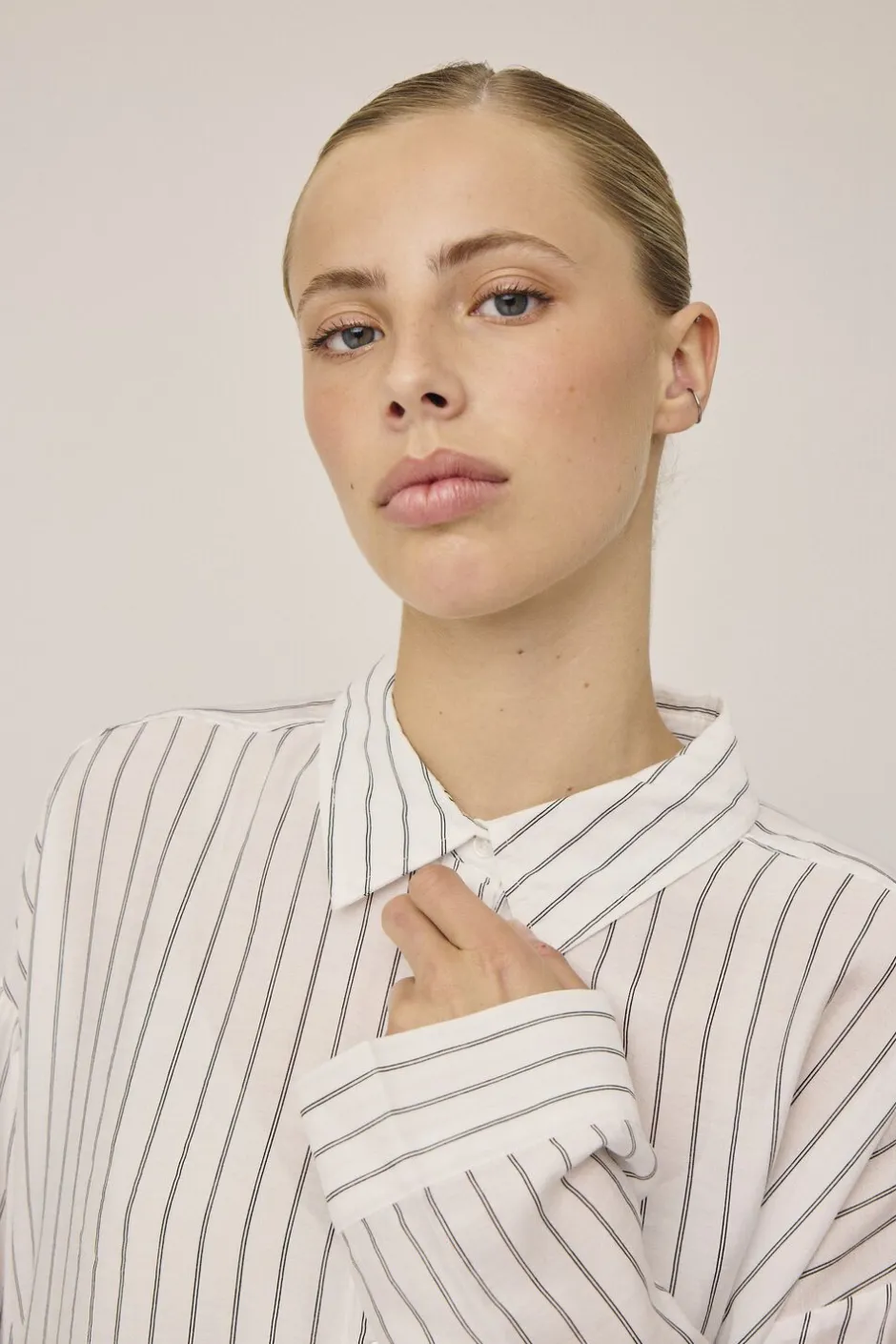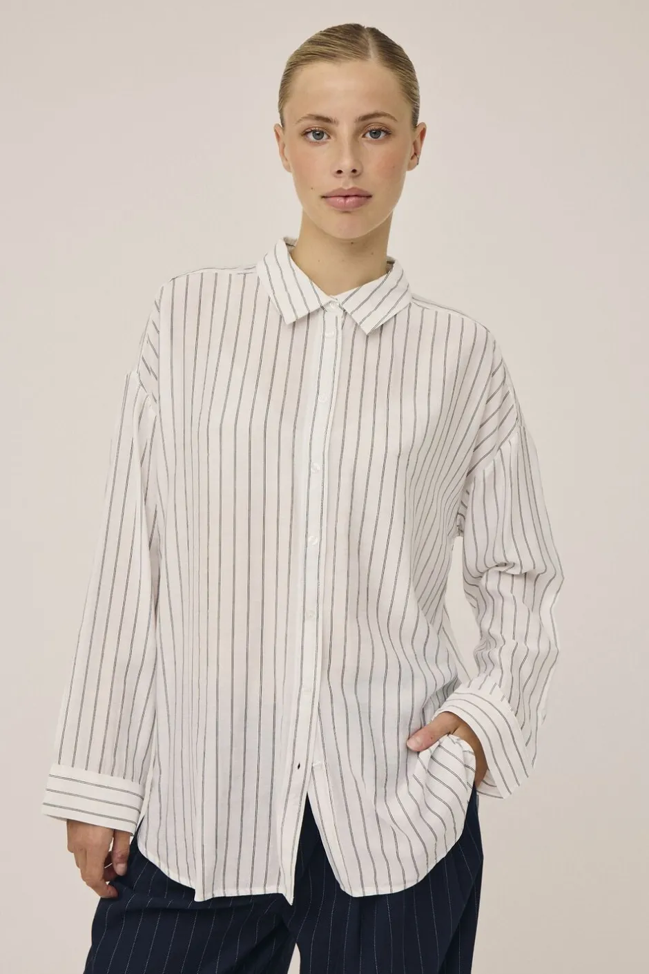 - Farve:Off white and black pinstripe
